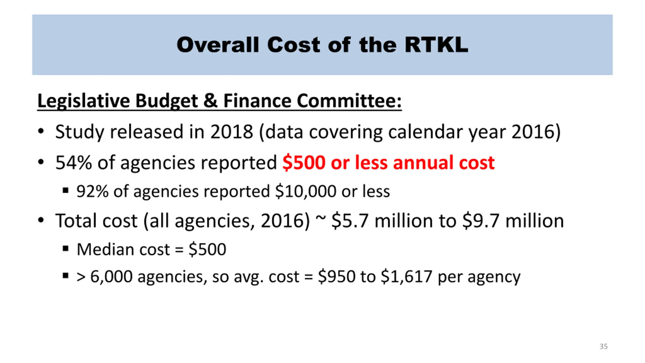 Overall Cost of the RTKL Legislative Budget & Finance Committee: Study released in 2018 (data covering calendar year 2016) 54% of agencies reported $500 or less annual cost 92% of agencies reported $10,000 or less Total cost (all agencies, 2016) ~ $5.7 million to $9.7 million Median cost = $500 > 6,000 agencies, so avg. cost = $950 to $1,617 per agency 35