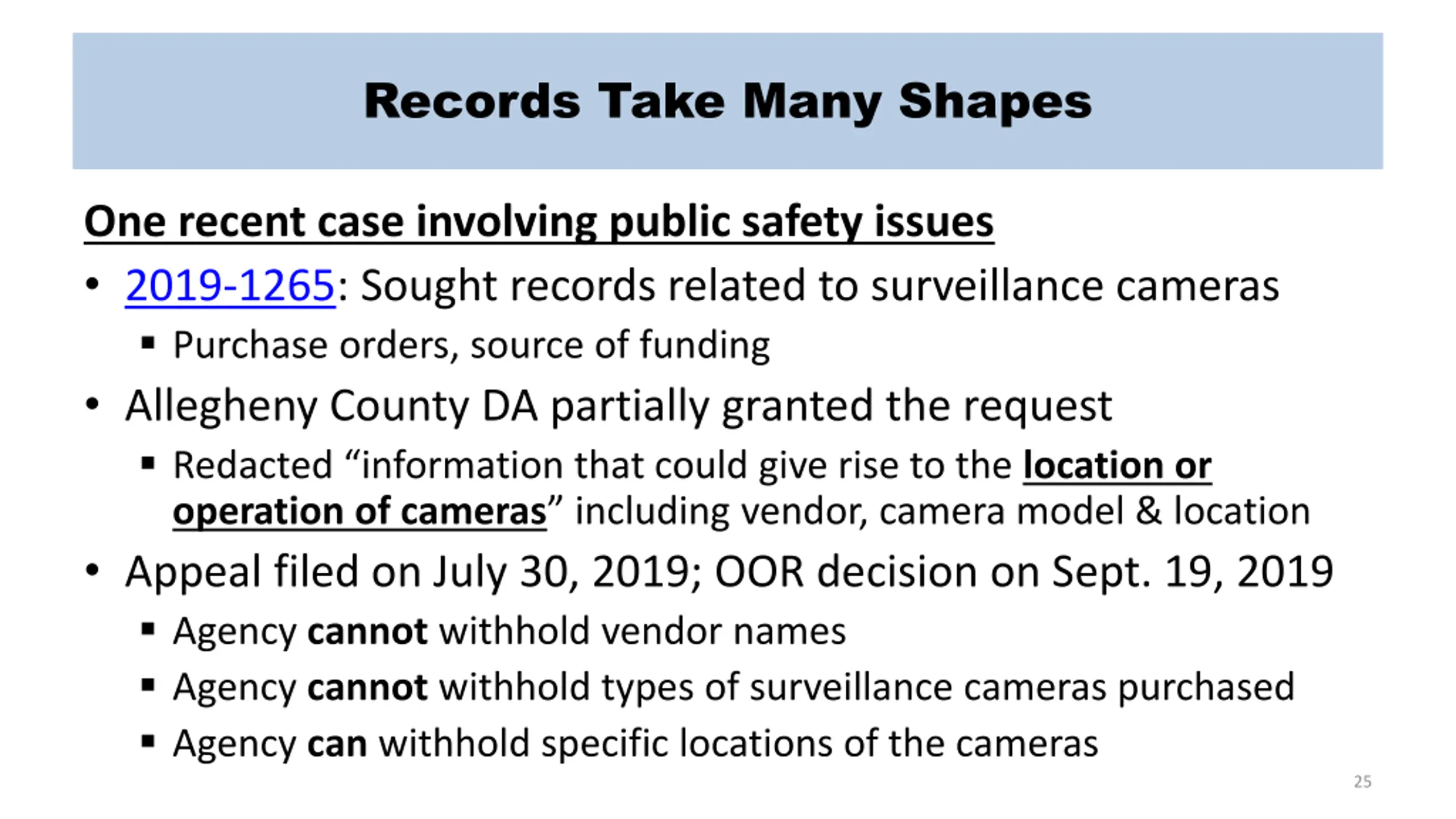 Records Take Many Shapes One recent case involving public safety issues 2019-1265: Sought records related to surveillance cameras Purchase orders, source of funding Allegheny County DA partially granted the request Redacted information that could give rise to the location or operation of cameras including vendor, camera model & location Appeal filed on July 30, 2019; OOR decision on Sept. 19, 2019 Agency cannot withhold vendor names Agency cannot withhold types of surveillance cameras purchased Agency can withhold specific locations of the cameras 25