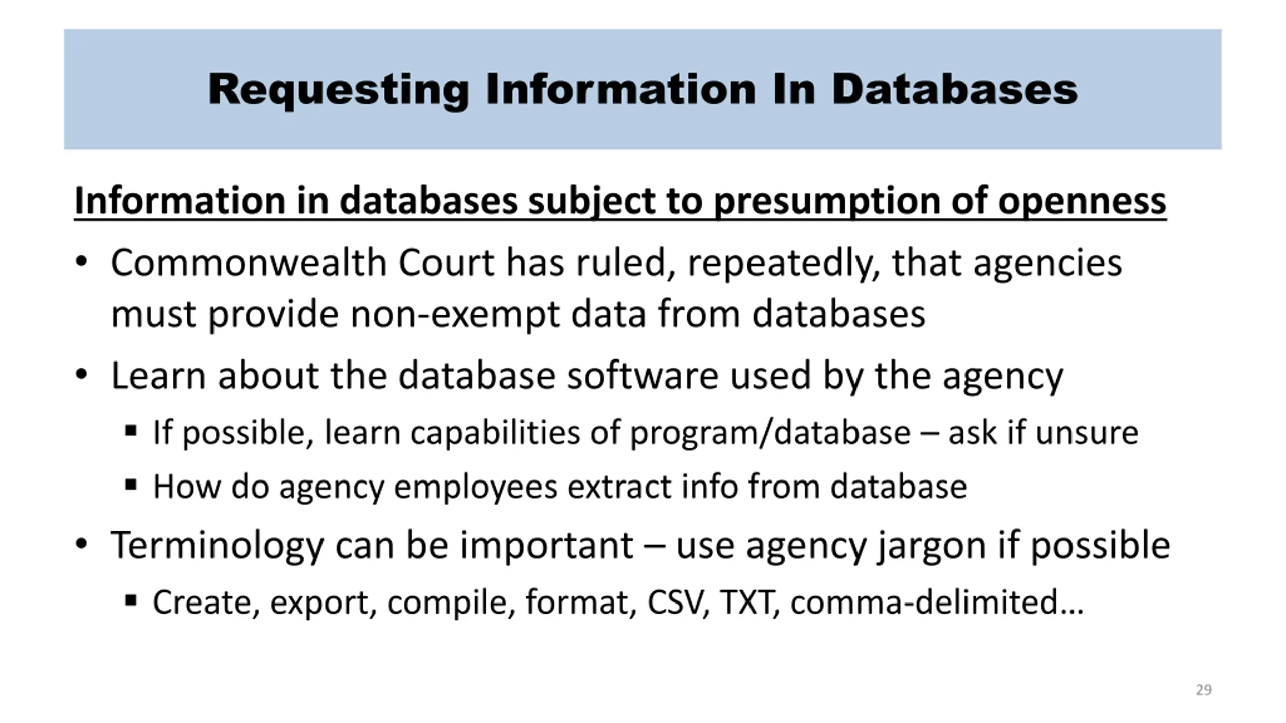 Requesting Information In Databases Information in databases subject to presumption of openness Commonwealth Court has ruled, repeatedly, that agencies must provide non-exempt data from databases Learn about the database software used by the agency If possible, learn capabilities of program/database ask if unsure How do agency employees extract info from database Terminology can be important use agency jargon if possible Create, export, compile, format, CSV, TXT, comma-delimited 29