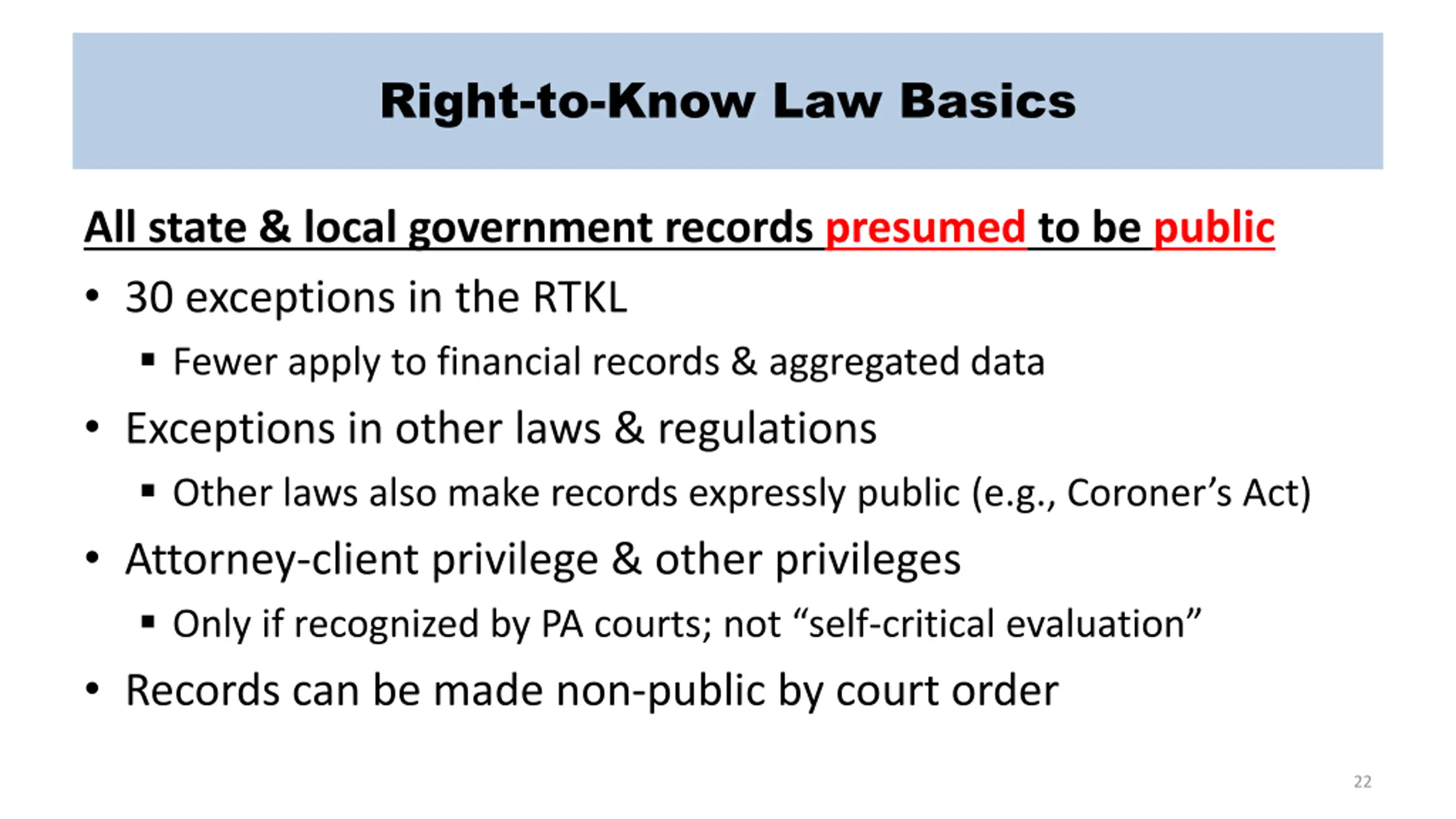 Right-to-Know Law Basics All state & local government records presumed to be public 30 exceptions in the RTKL Fewer apply to financial records & aggregated data Exceptions in other laws & regulations Other laws also make records expressly public (e.g., Coroner s Act) Attorney-client privilege & other privileges Only if recognized by PA courts; not self-critical evaluation Records can be made non-public by court order 22