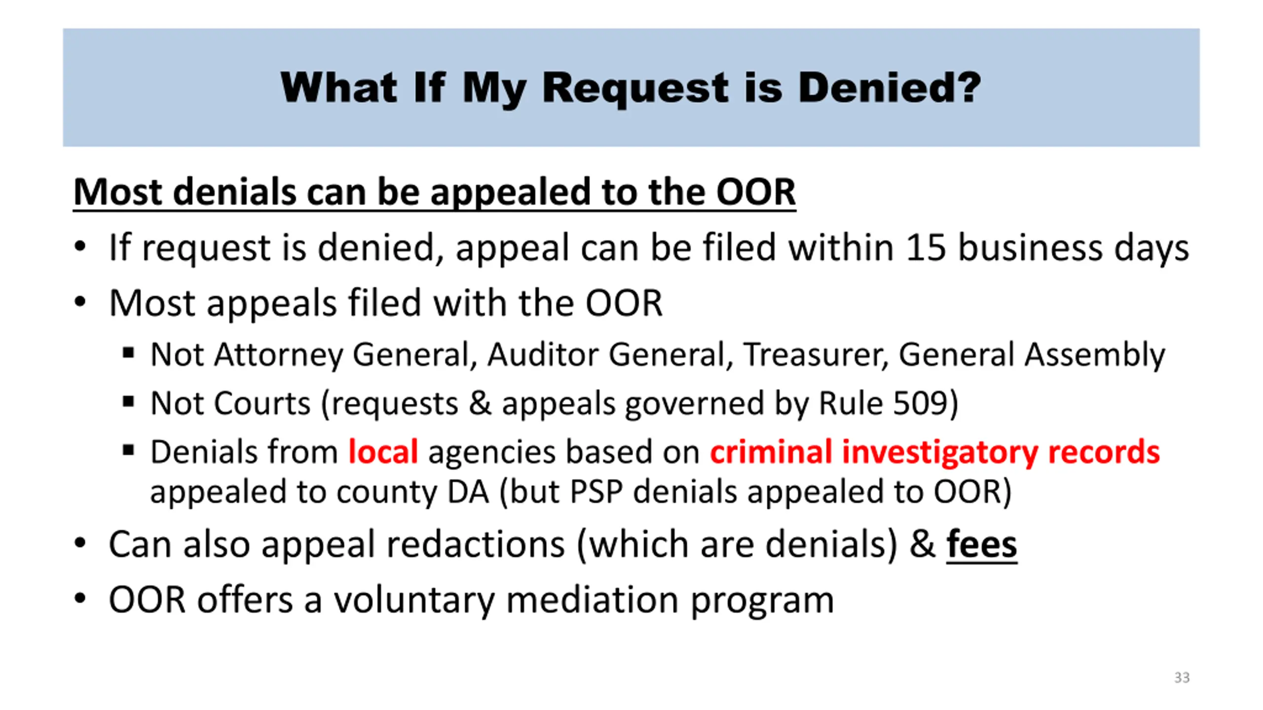 What If My Request is Denied? Most denials can be appealed to the OOR If request is denied, appeal can be filed within 15 business days Most appeals filed with the OOR Not Attorney General, Auditor General, Treasurer, General Assembly Not Courts (requests & appeals governed by Rule 509) Denials from local agencies based on criminal investigatory records appealed to county DA (but PSP denials appealed to OOR) Can also appeal redactions (which are denials) & fees OOR offers a voluntary mediation program 33