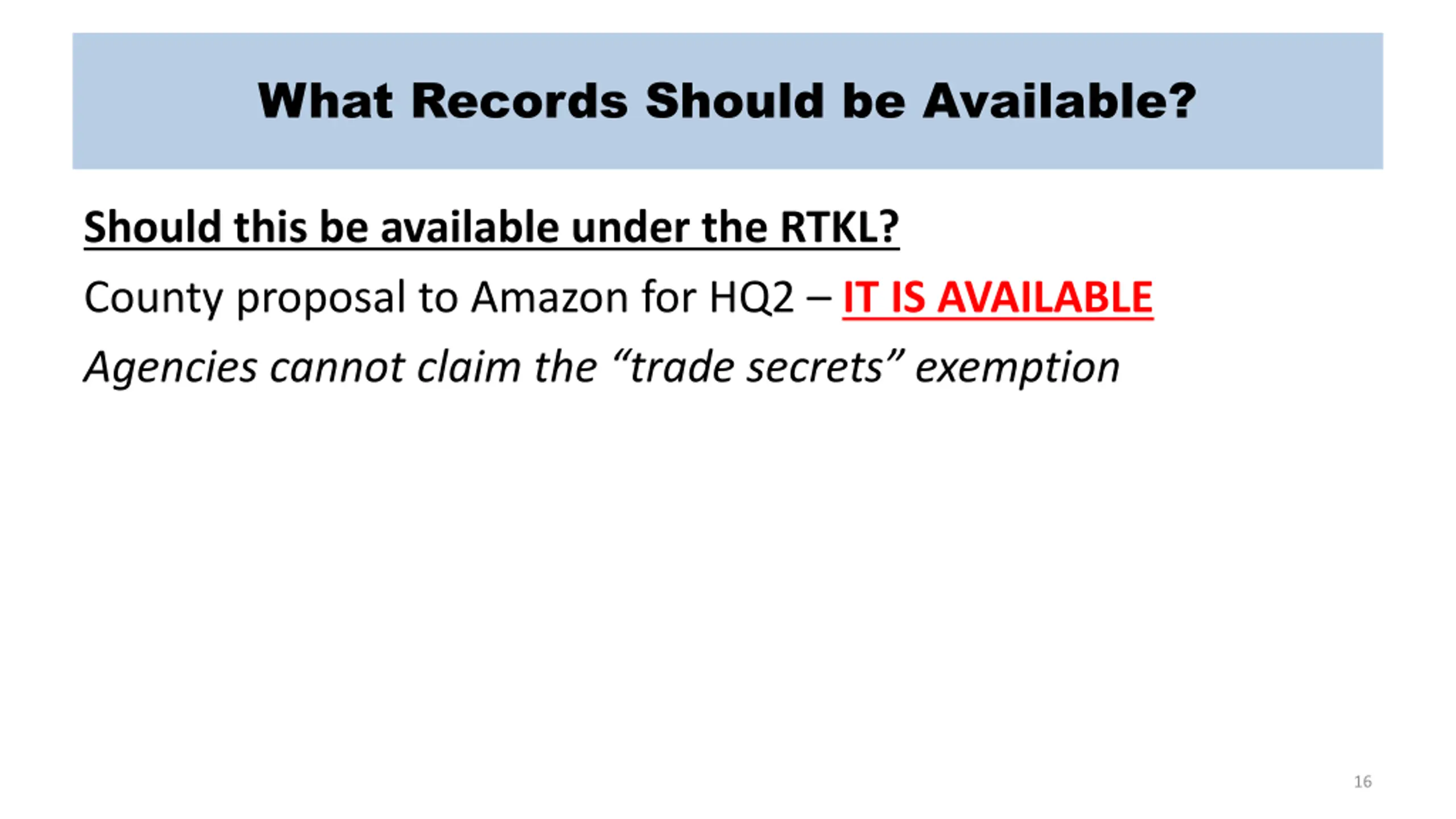 What Records Should be Available? Should this be available under the RTKL? County proposal to Amazon for HQ2 IT IS AVAILABLE Agencies cannot claim the trade secrets exemption 16