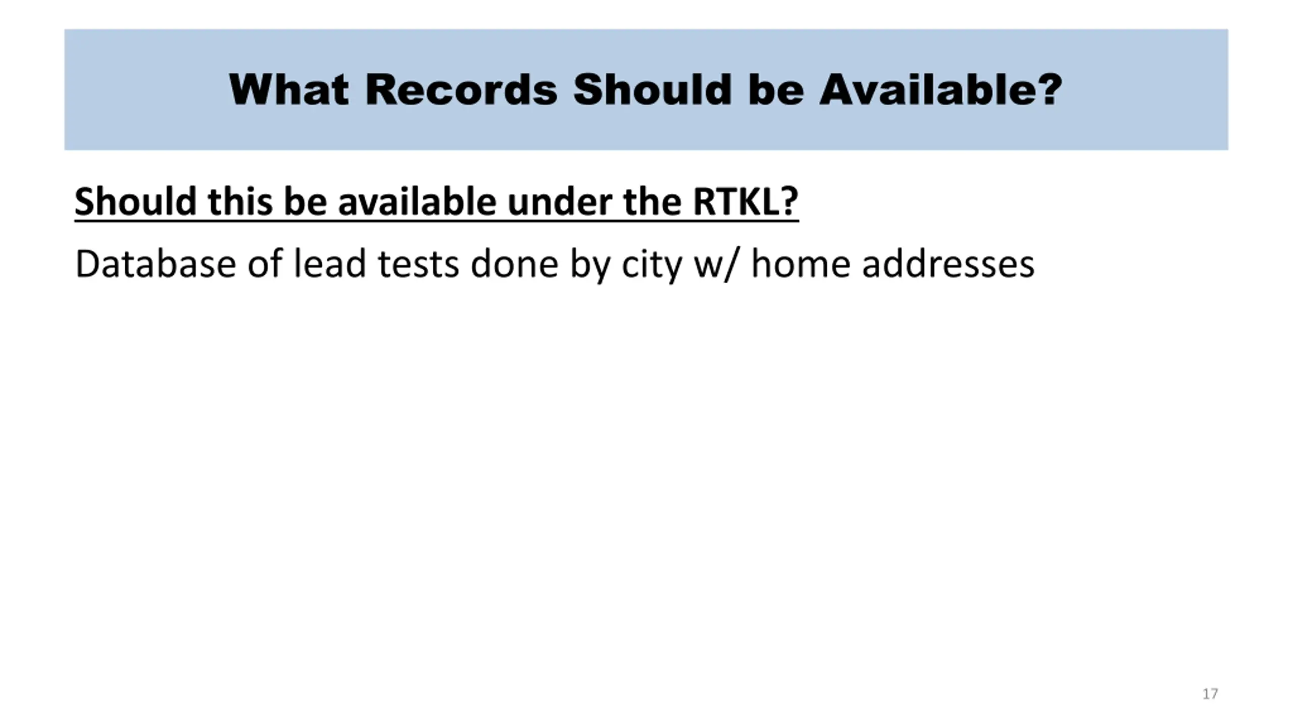 What Records Should be Available? Should this be available under the RTKL? Database of lead tests done by city w/ home addresses 17