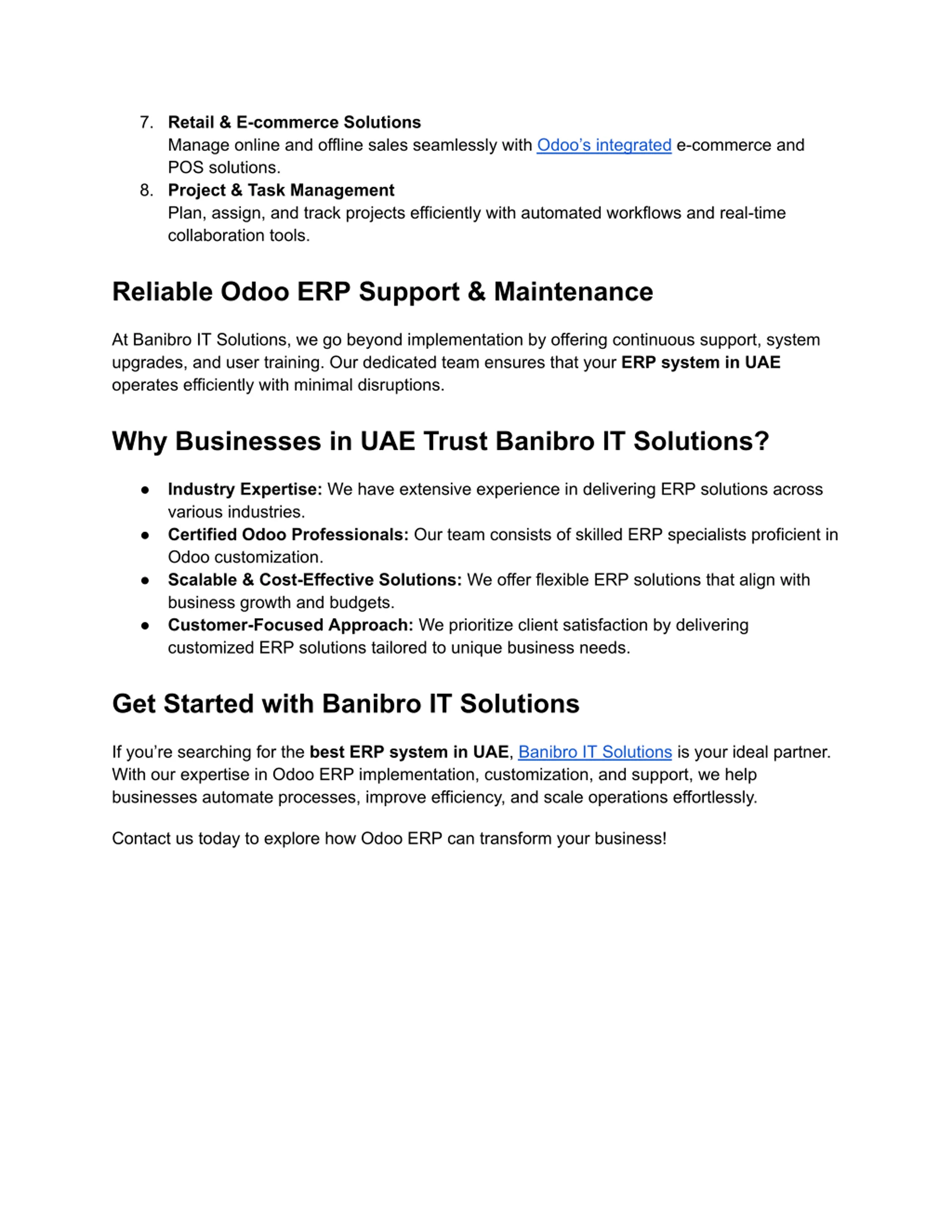7. Retail & E-commerce Solutions Manage online and offline sales seamlessly with Odoo s integrated e-commerce and POS solutions. 8. Project & Task Management Plan, assign, and track projects efficiently with automated workflows and real-time collaboration tools. Reliable Odoo ERP Support & Maintenance At Banibro IT Solutions, we go beyond implementation by offering continuous support, system upgrades, and user training. Our dedicated team ensures that your ERP system in UAE operates efficiently with minimal disruptions. Why Businesses in UAE Trust Banibro IT Solutions? Industry Expertise: We have extensive experience in delivering ERP solutions across various industries. Certified Odoo Professionals: Our team consists of skilled ERP specialists proficient in Odoo customization. Scalable & Cost-Effective Solutions: We offer flexible ERP solutions that align with business growth and budgets. Customer-Focused Approach: We prioritize client satisfaction by delivering customized ERP solutions tailored to unique business needs. Get Started with Banibro IT Solutions If you re searching for the best ERP system in UAE, Banibro IT Solutions is your ideal partner. With our expertise in Odoo ERP implementation, customization, and support, we help businesses automate processes, improve efficiency, and scale operations effortlessly. Contact us today to explore how Odoo ERP can transform your business!