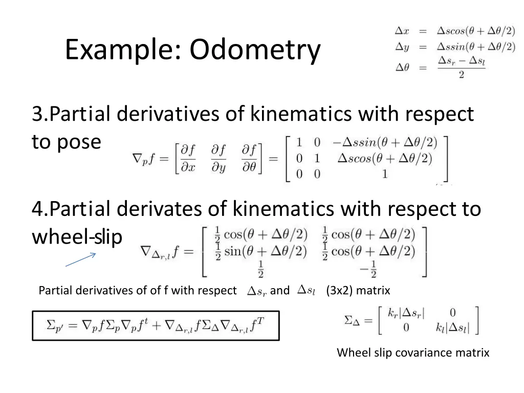 Example: Odometry 3.Partial derivatives of kinematics with respect to pose 4.Partial derivates of kinematics with respect to wheel-slip Partial derivatives of of f with respect and (3x2) matrix Wheel slip covariance matrix