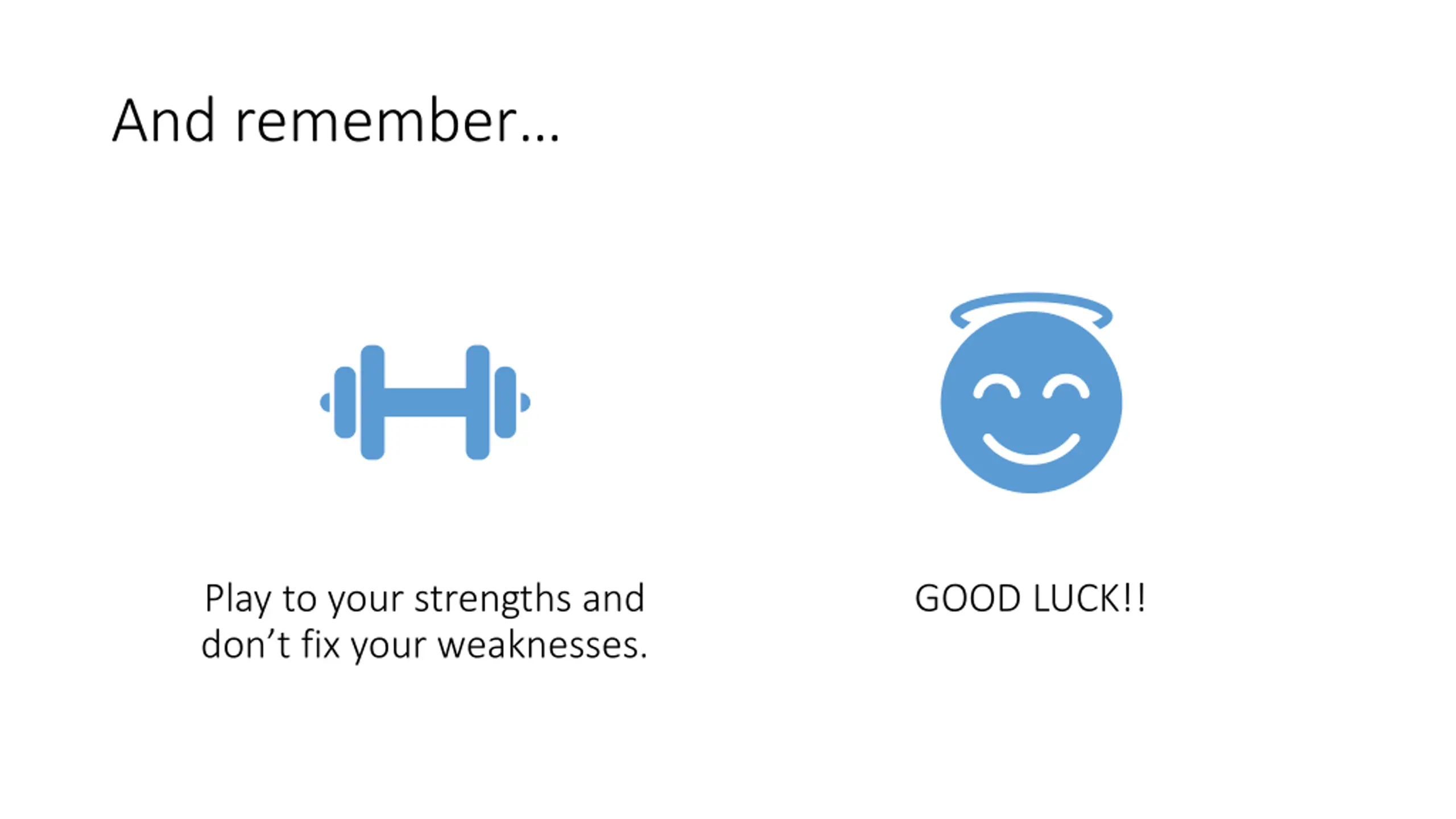 And remember Play to your strengths and don t fix your weaknesses. GOOD LUCK!!