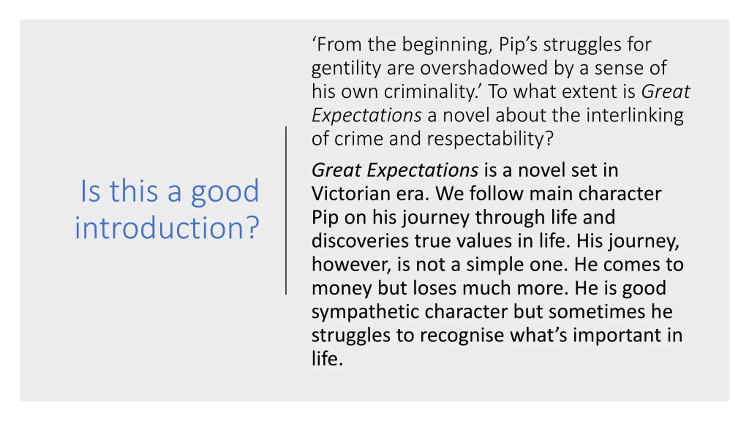 From the beginning, Pips struggles for gentility are overshadowed by a sense of his own criminality. To what extent is Great Expectations a novel about the interlinking of crime and respectability? Great Expectations is a novel set in Victorian era. We follow main character Pip on his journey through life and discoveries true values in life. His journey, however, is not a simple one. He comes to money but loses much more. He is good sympathetic character but sometimes he struggles to recognise what s important in life. Is this a good introduction?