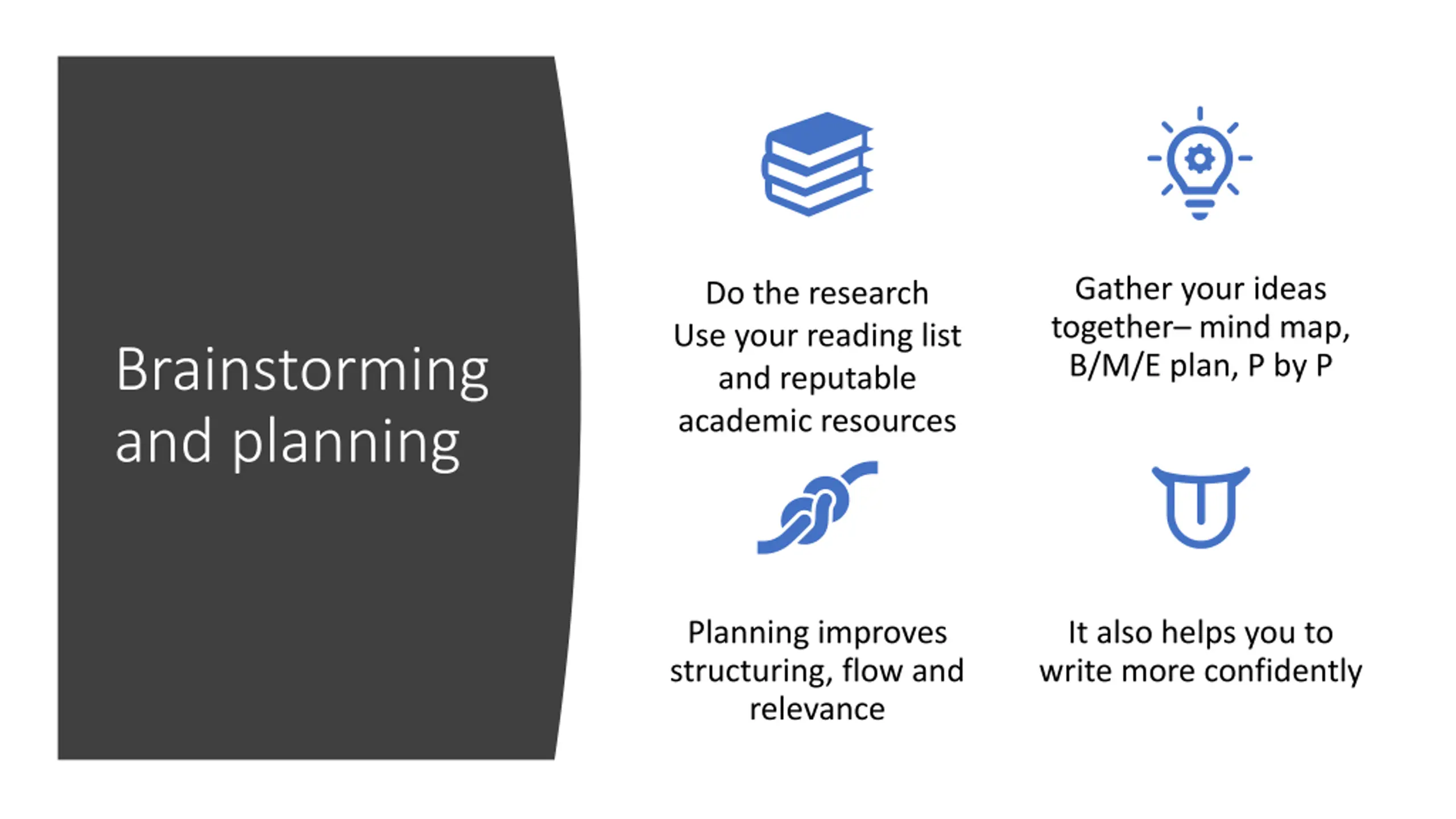 Gather your ideas together mind map, B/M/E plan, P by P Do the research Use your reading list and reputable academic resources Brainstorming and planning Planning improves structuring, flow and relevance It also helps you to write more confidently