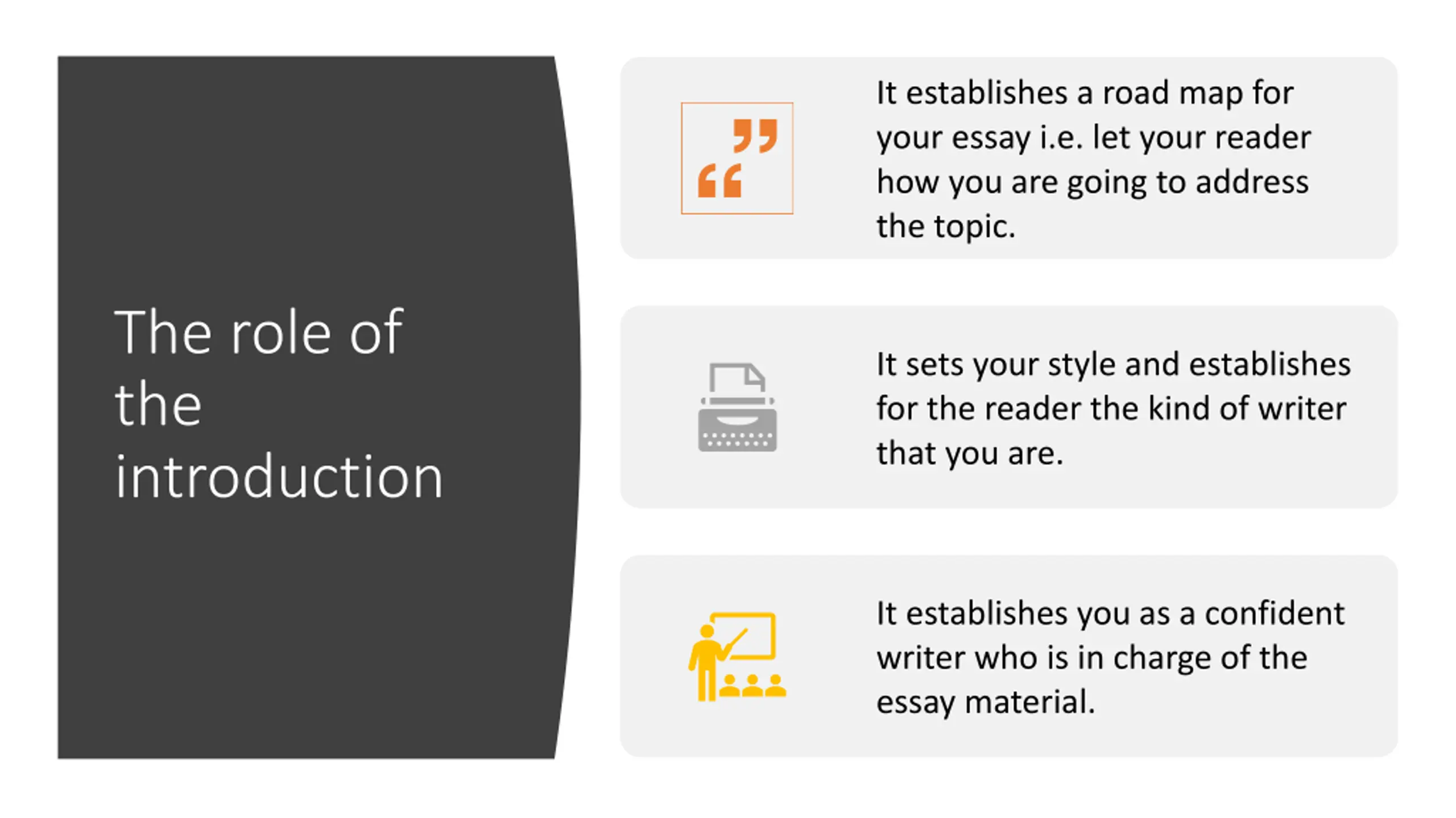 It establishes a road map for your essay i.e. let your reader how you are going to address the topic. The role of the introduction It sets your style and establishes for the reader the kind of writer that you are. It establishes you as a confident writer who is in charge of the essay material.
