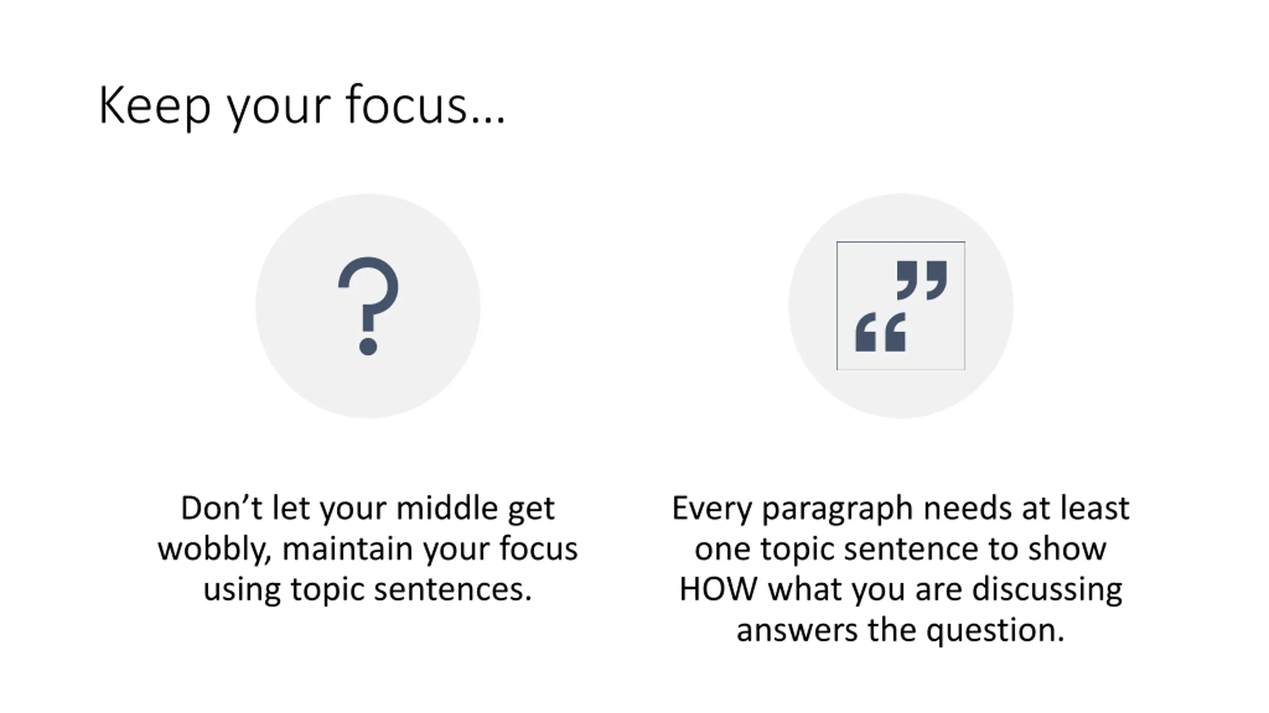 Keep your focus Don t let your middle get wobbly, maintain your focus using topic sentences. Every paragraph needs at least one topic sentence to show HOW what you are discussing answers the question.