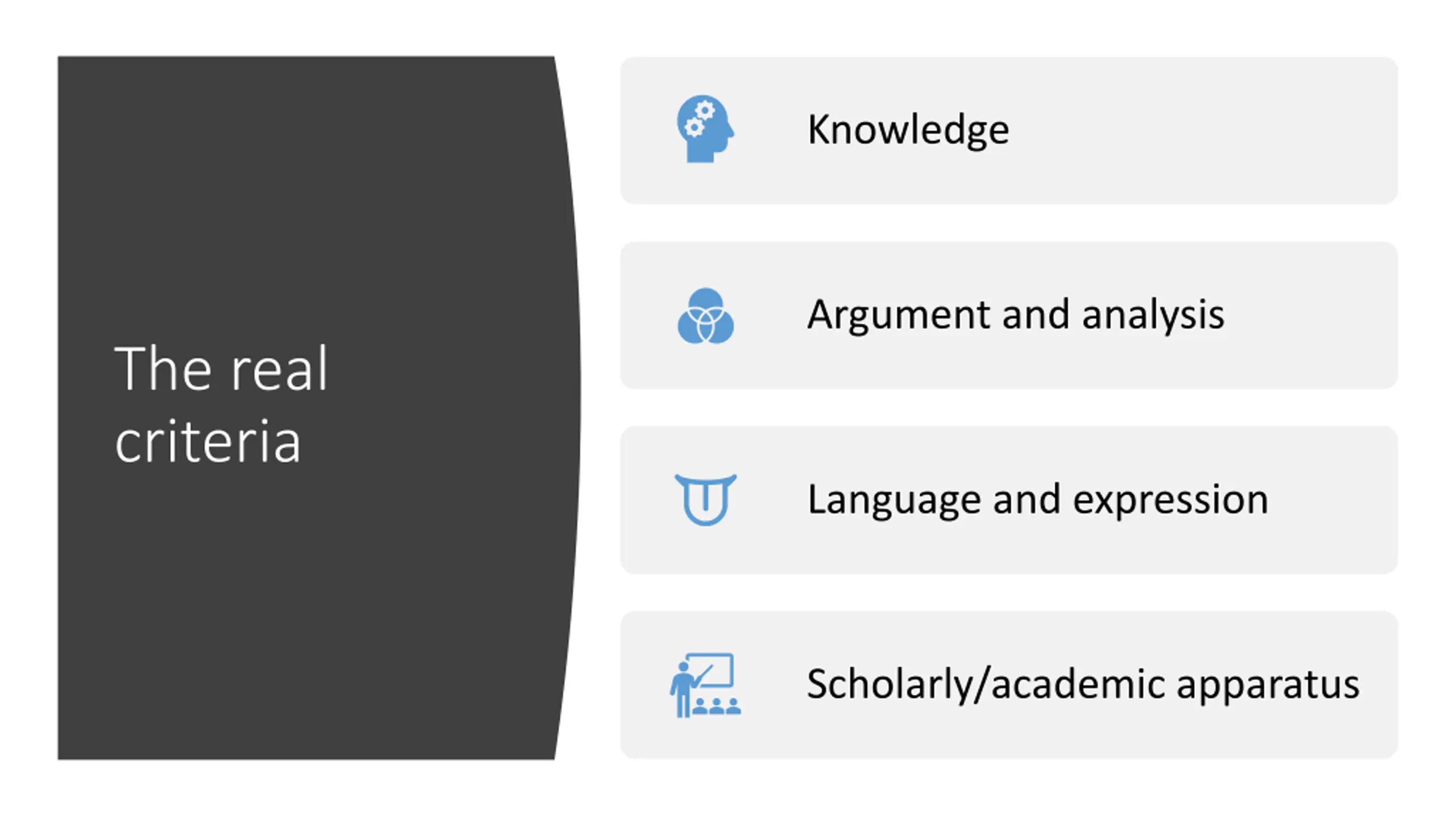 Knowledge Argument and analysis The real criteria Language and expression Scholarly/academic apparatus