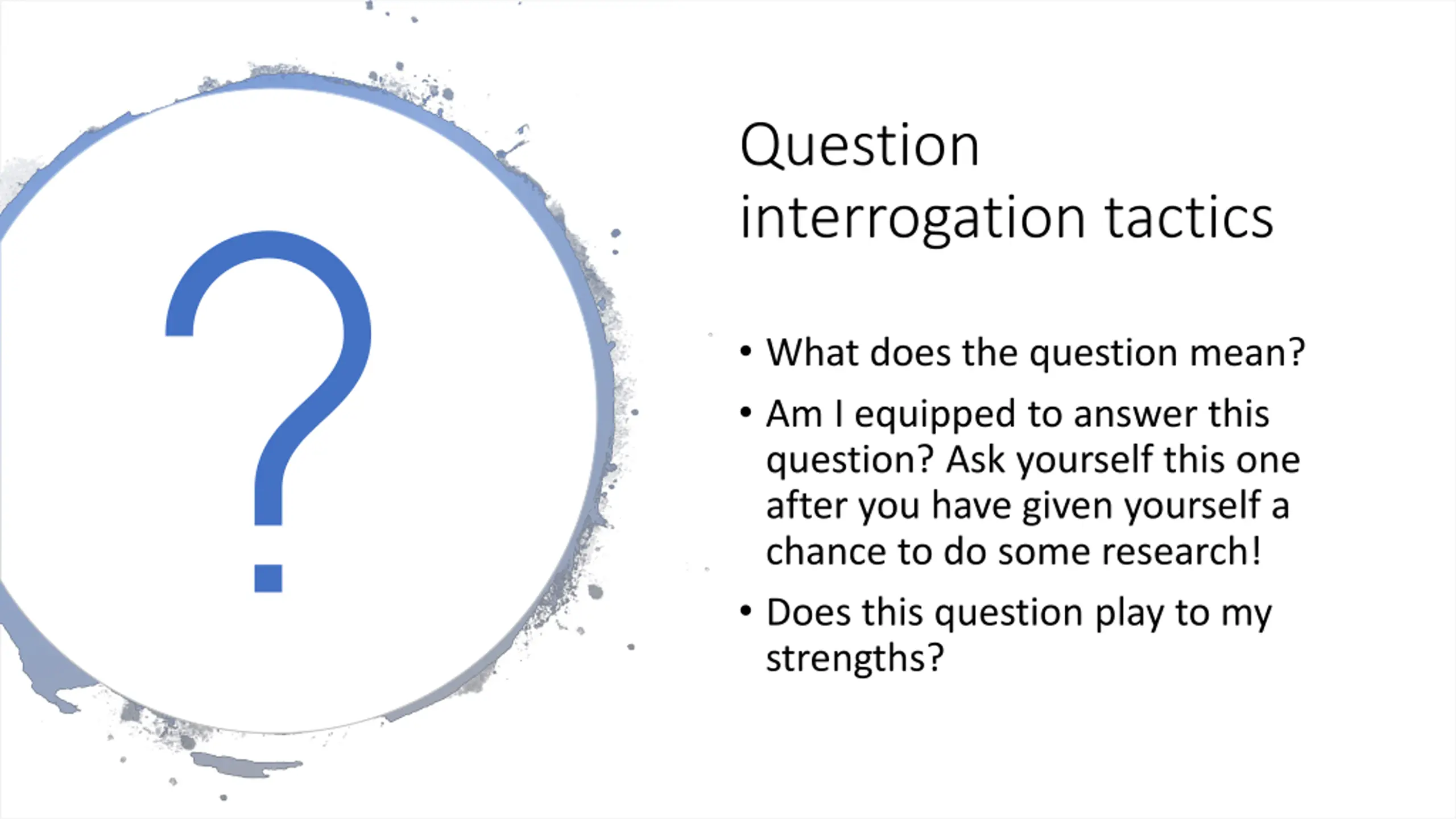 Question interrogation tactics What does the question mean? Am I equipped to answer this question? Ask yourself this one after you have given yourself a chance to do some research! Does this question play to my strengths?