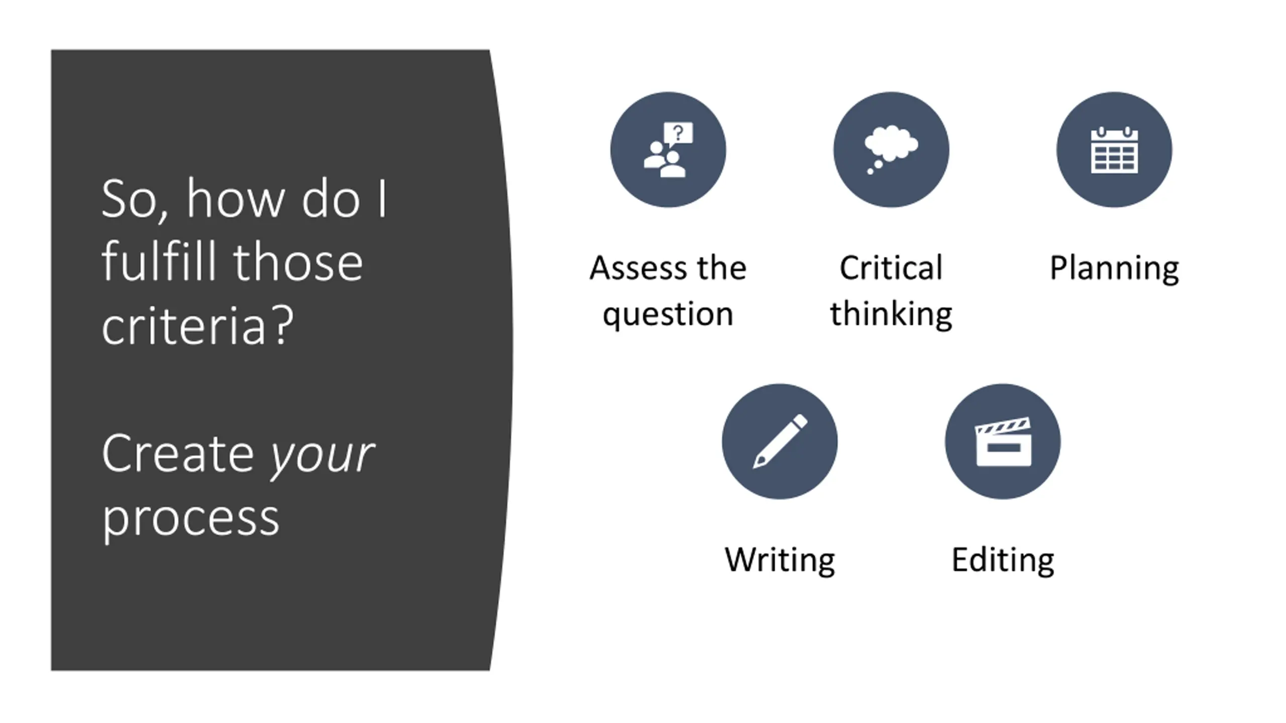 So, how do I fulfill those criteria? Assess the question Critical thinking Planning Create your process Writing Editing