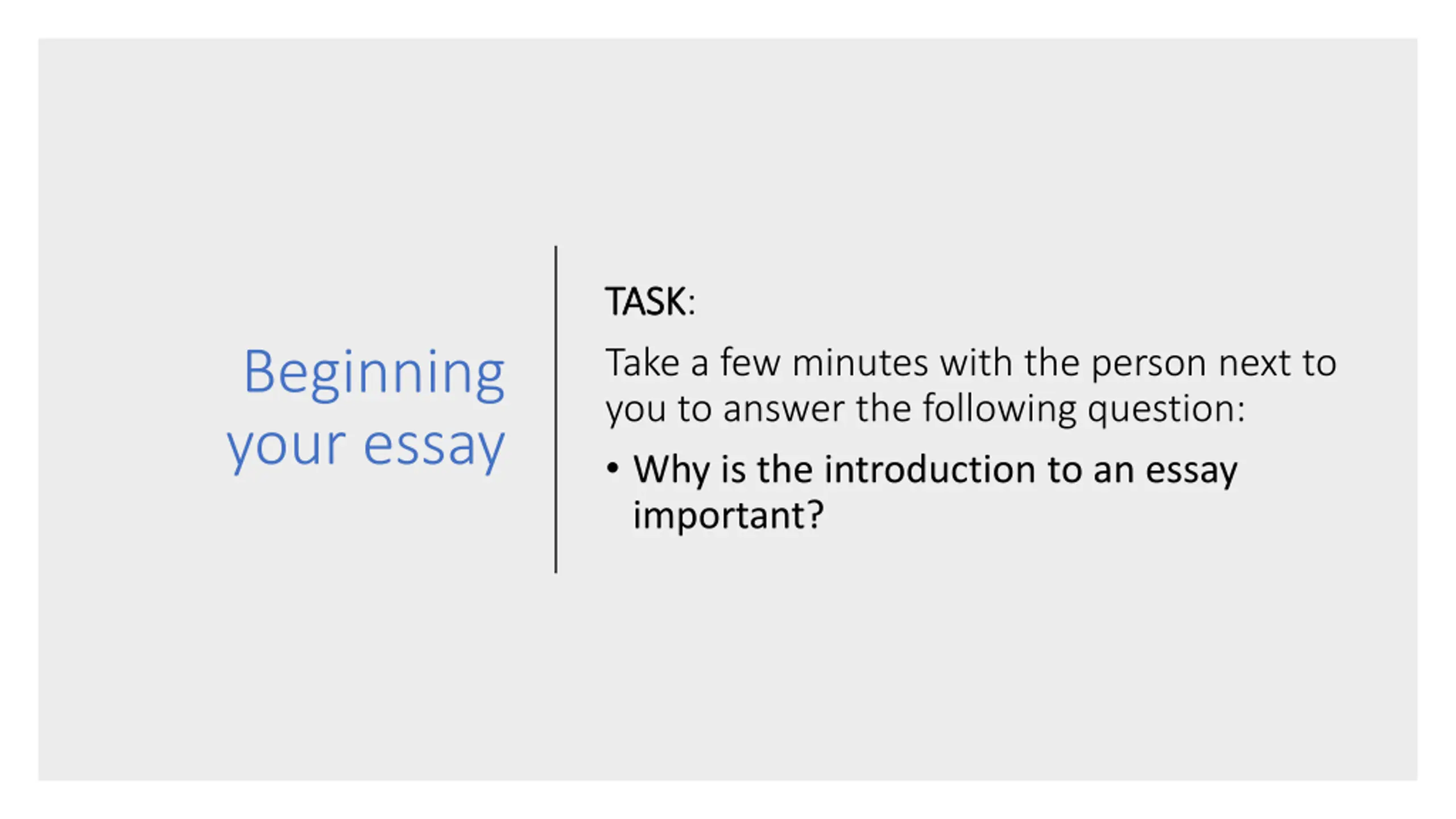 TASK TASK: Take a few minutes with the person next to you to answer the following question: Why is the introduction to an essay important? Beginning your essay