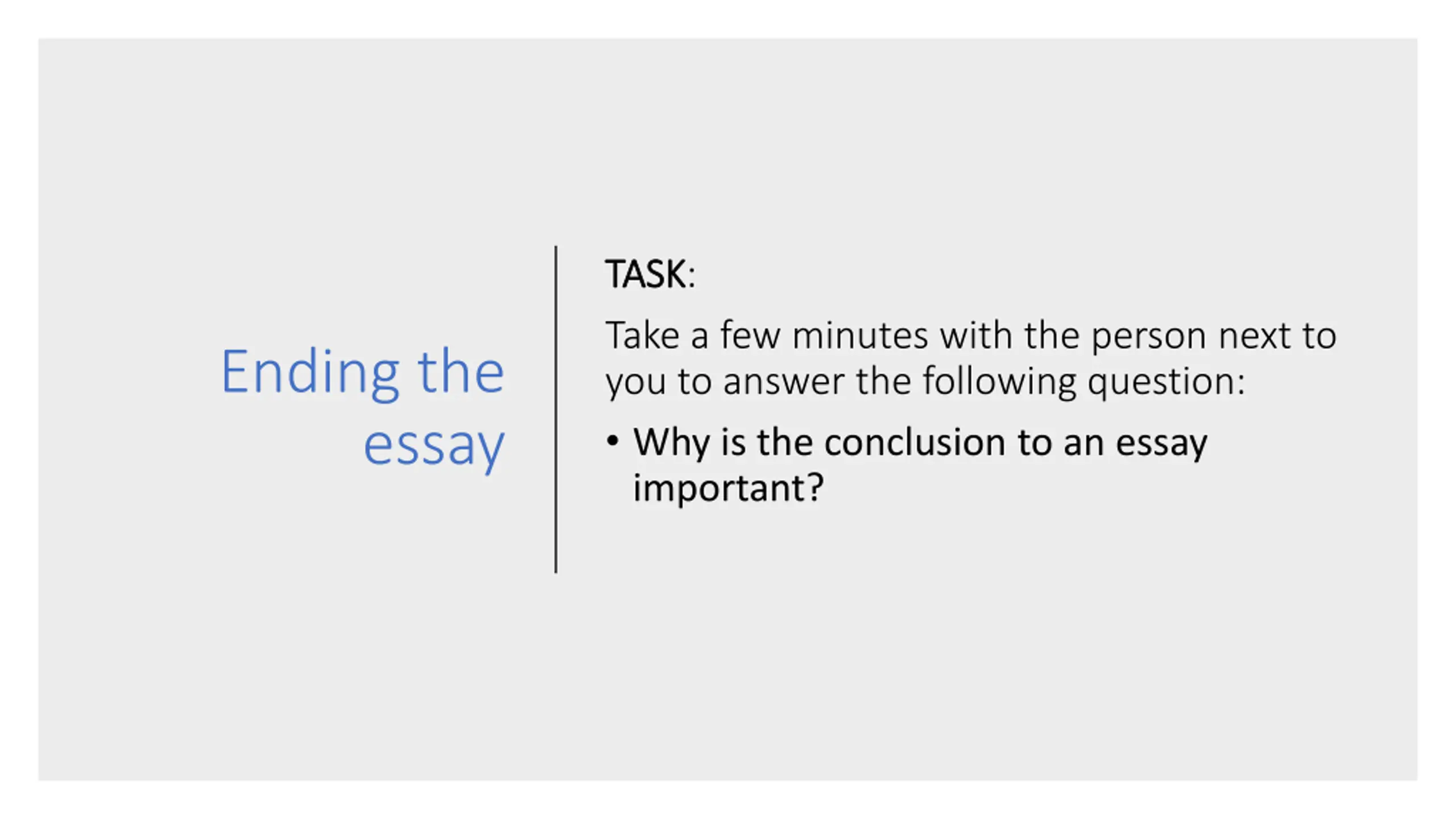 TASK TASK: Take a few minutes with the person next to you to answer the following question: Why is the conclusion to an essay important? Ending the essay