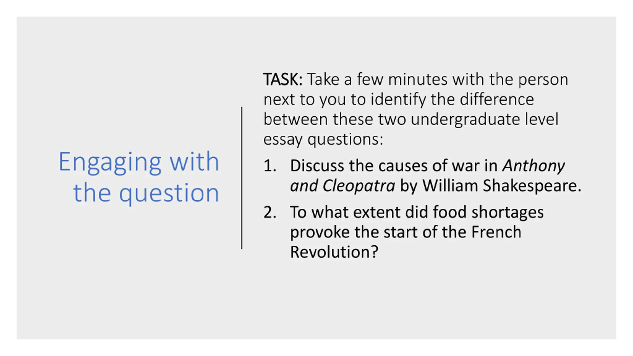 TASK: TASK: Take a few minutes with the person next to you to identify the difference between these two undergraduate level essay questions: 1. Discuss the causes of war in Anthony and Cleopatra by William Shakespeare. 2. To what extent did food shortages provoke the start of the French Revolution? Engaging with the question