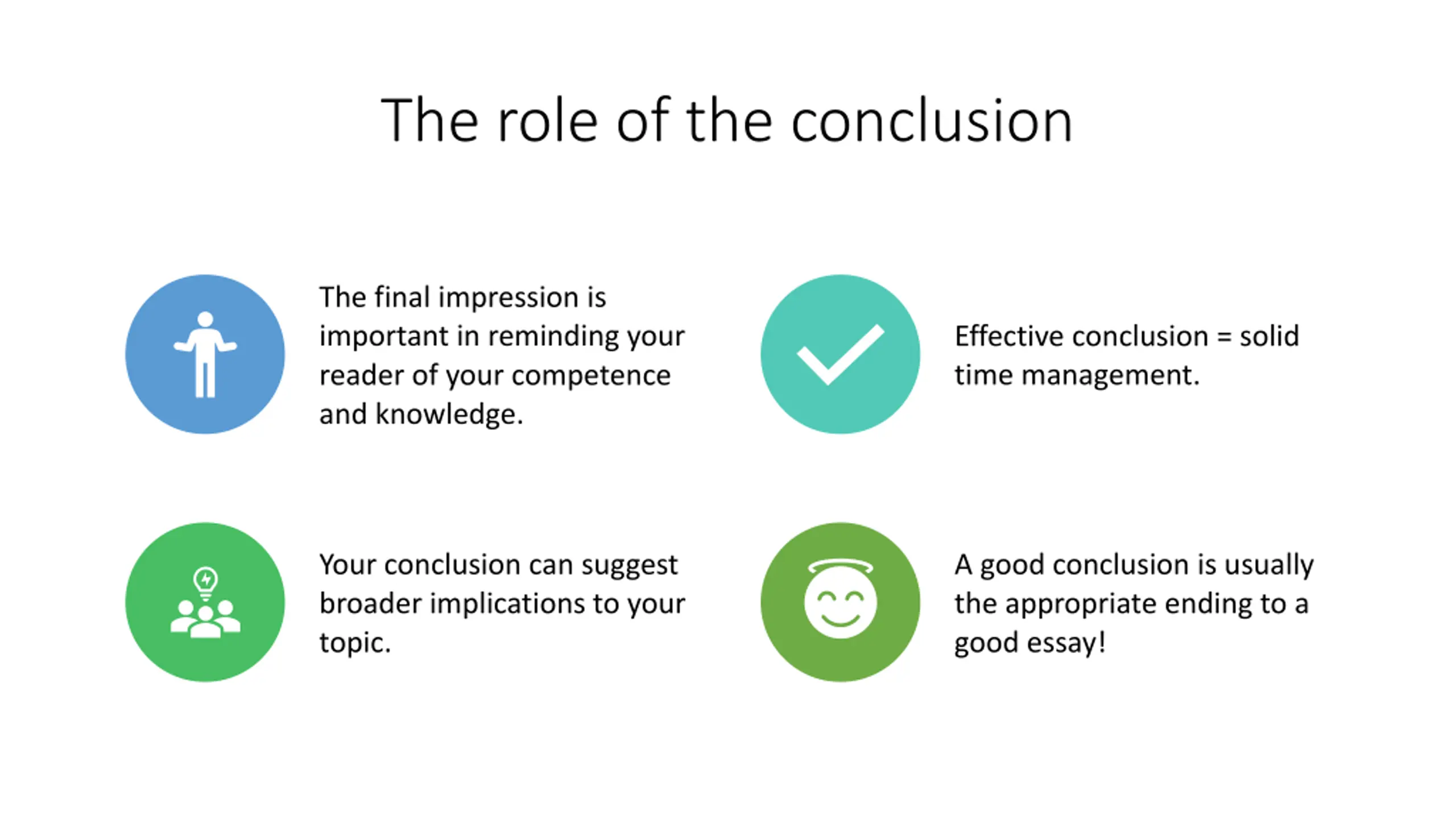 The role of the conclusion The final impression is important in reminding your reader of your competence and knowledge. Effective conclusion = solid time management. Your conclusion can suggest broader implications to your topic. A good conclusion is usually the appropriate ending to a good essay!
