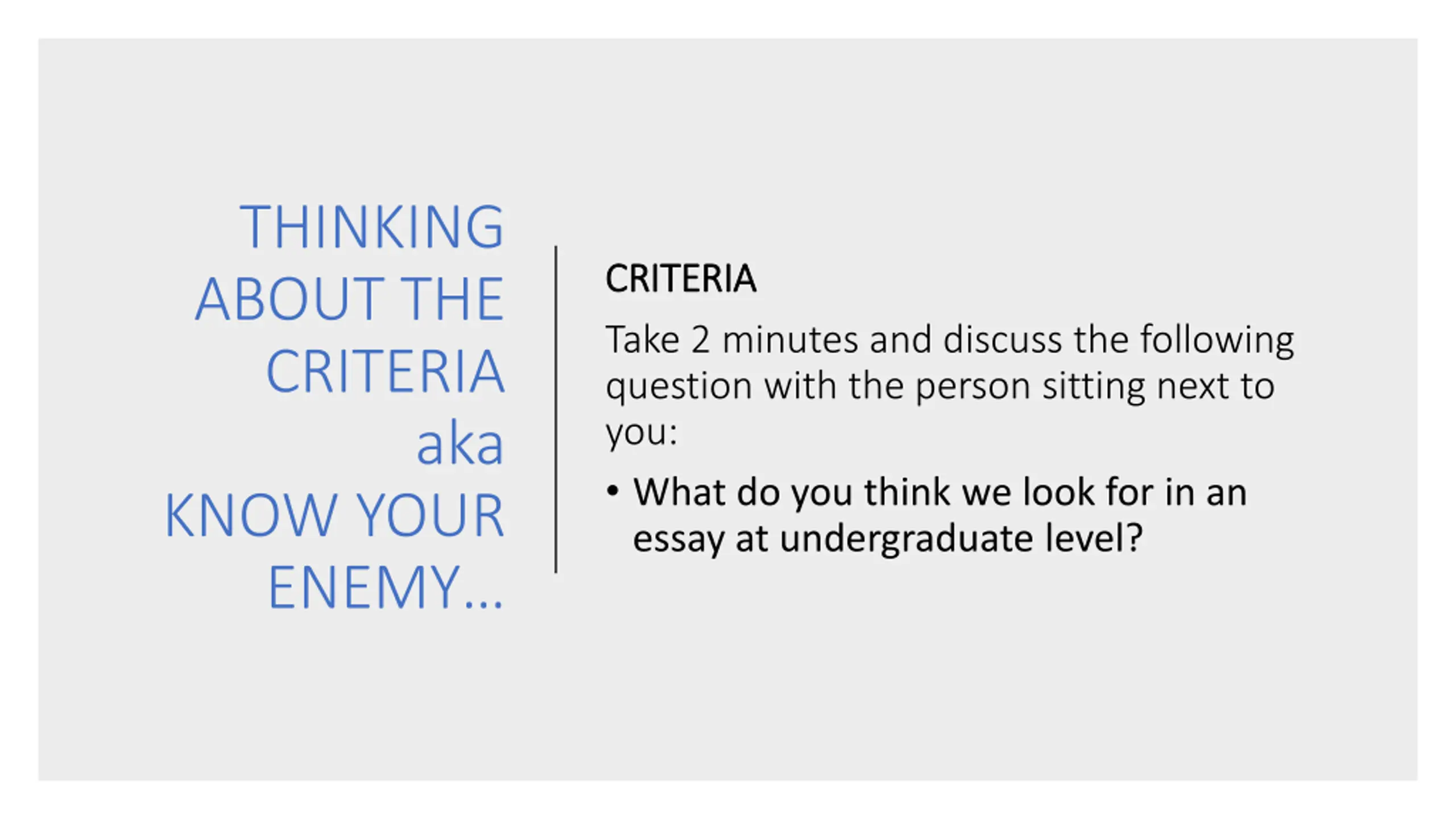 THINKING ABOUT THE CRITERIA CRITERIA CRITERIA Take 2 minutes and discuss the following question with the person sitting next to you: What do you think we look for in an essay at undergraduate level? aka KNOW YOUR ENEMY