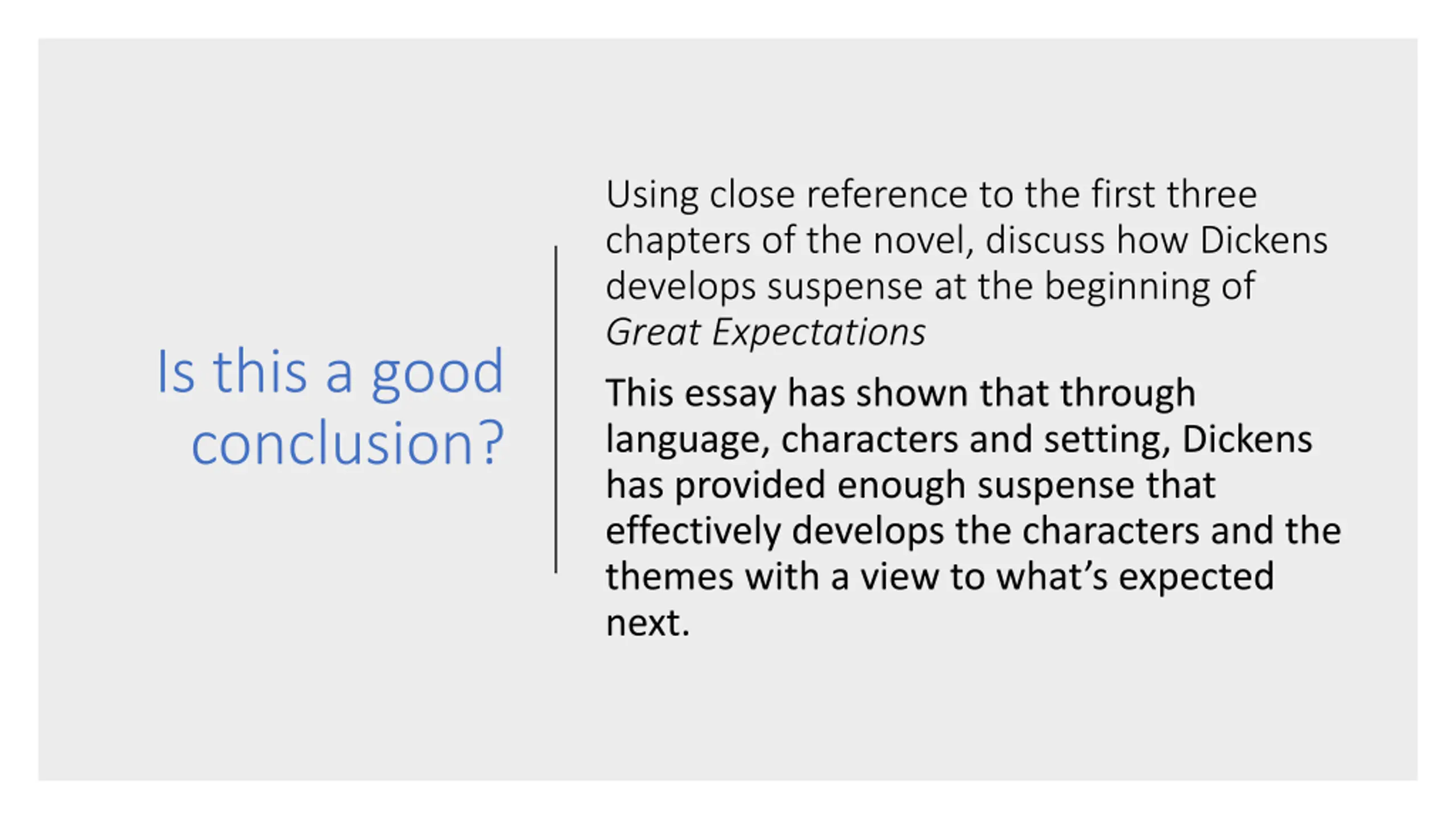 Using close reference to the first three chapters of the novel, discuss how Dickens develops suspense at the beginning of Great Expectations This essay has shown that through language, characters and setting, Dickens has provided enough suspense that effectively develops the characters and the themes with a view to what s expected next. Is this a good conclusion?