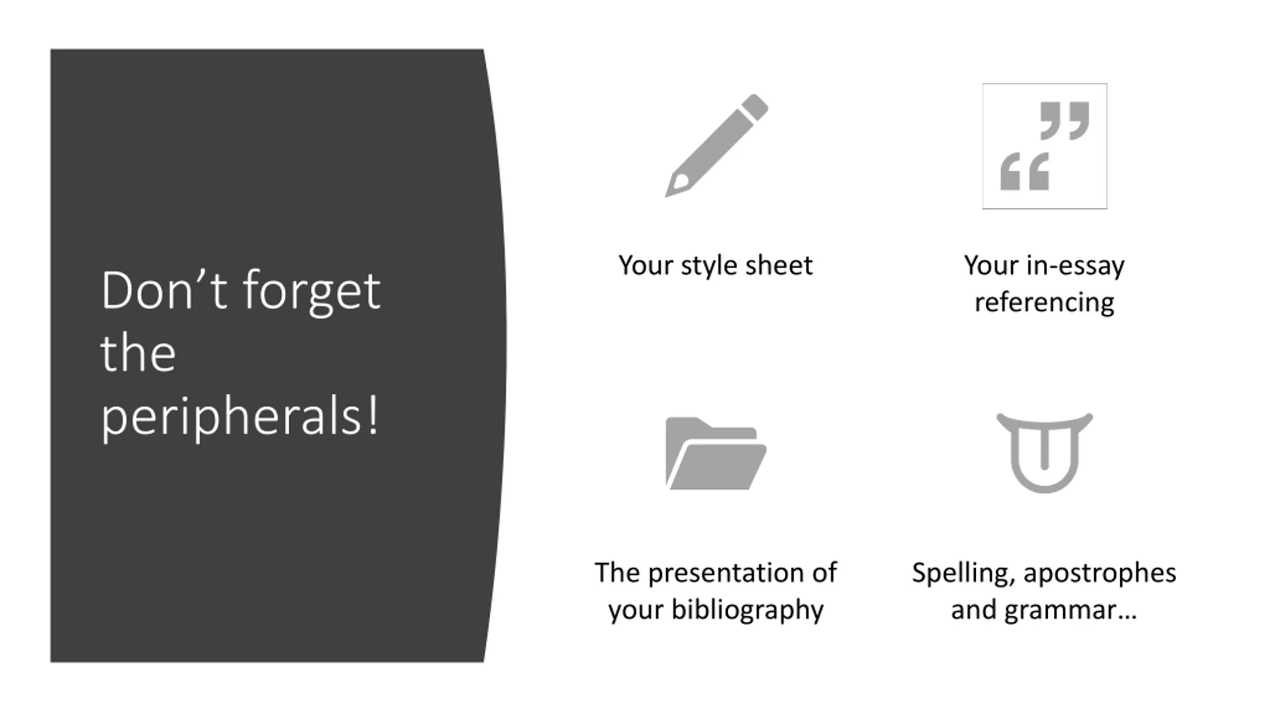 Your style sheet Your in-essay referencing Don t forget the peripherals! The presentation of your bibliography Spelling, apostrophes and grammar