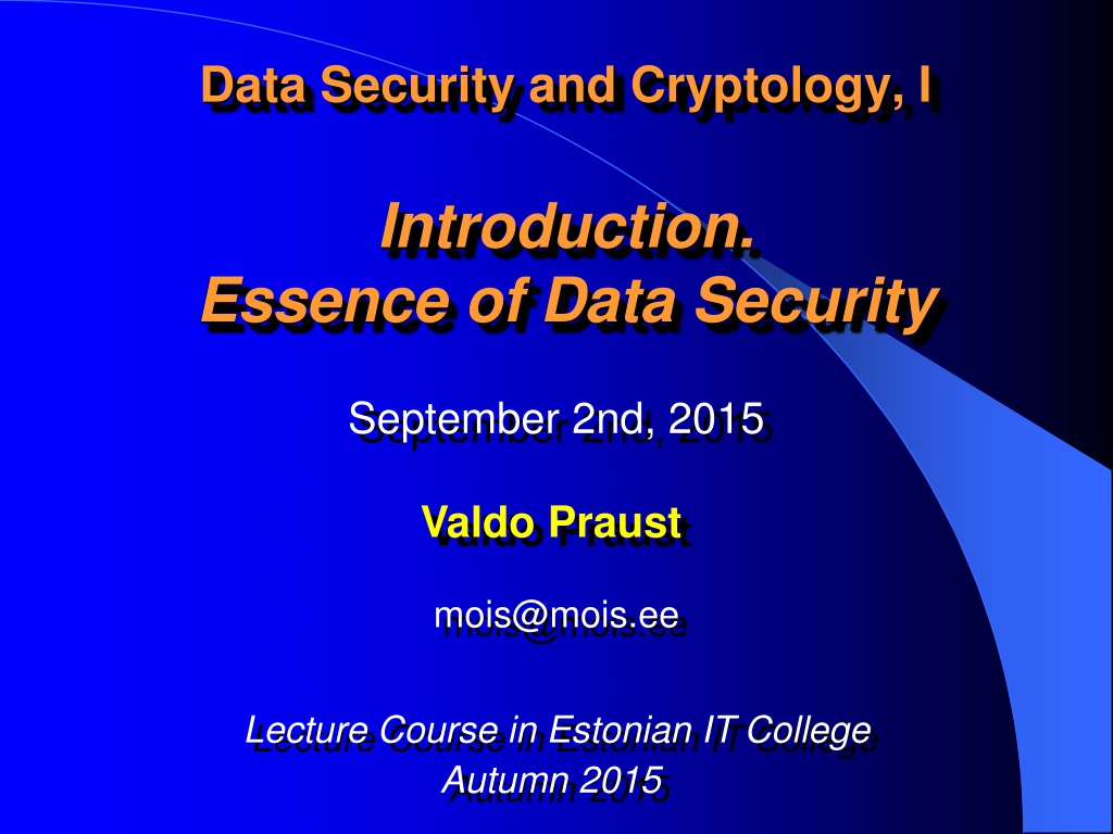 Data Security and Cryptology, I Introduction. Essence of Data Security September 2nd, 2015 Valdo Praust mois@mois.ee Lecture Course in Estonian IT College Autumn 2015