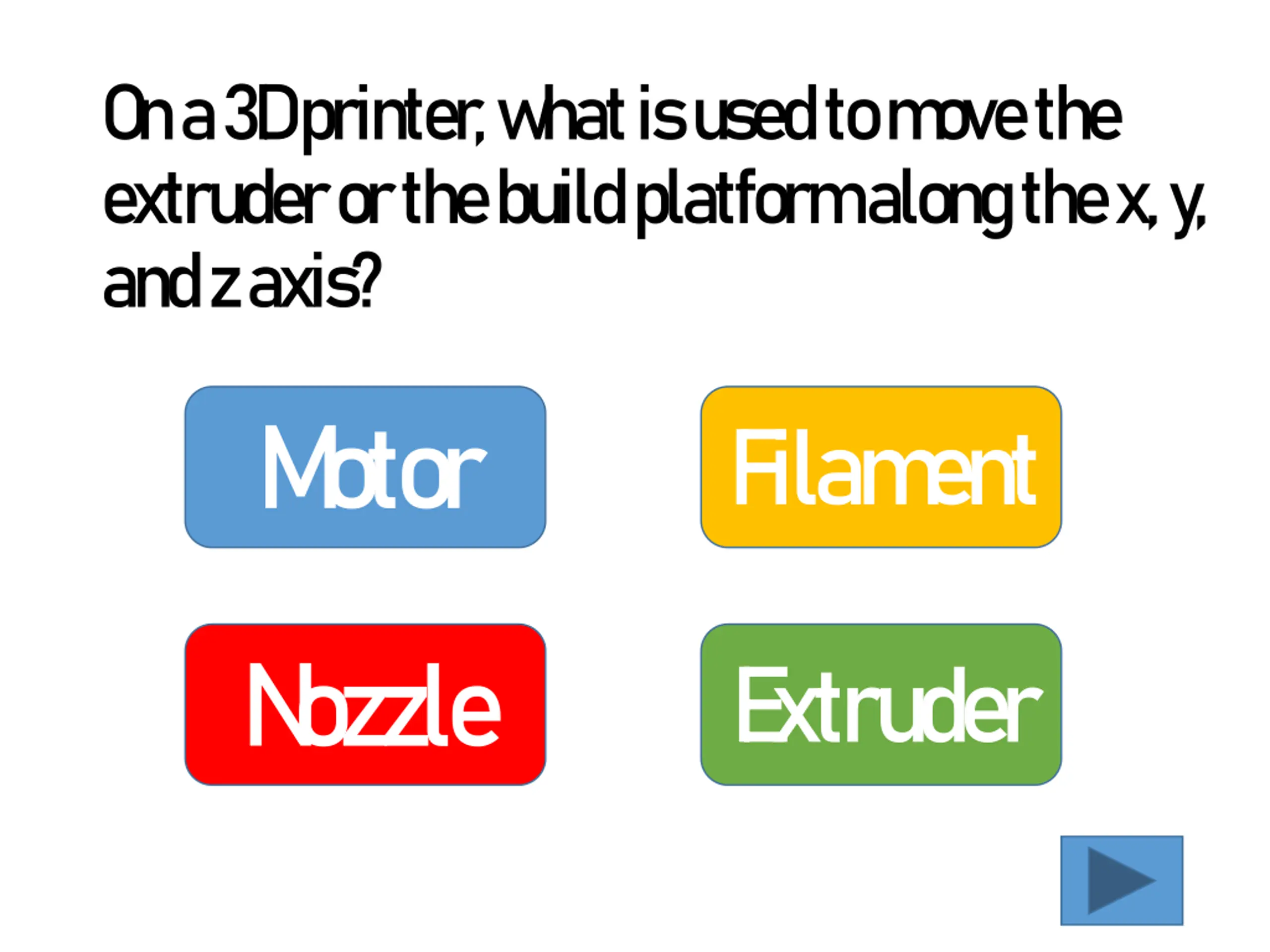On a 3D printer, w hat is used to m ove the extruder or the build platform along the x, y, and z axis? Motor Filament M otor Filam ent Nozzle Extruder N ozzle E xtruder