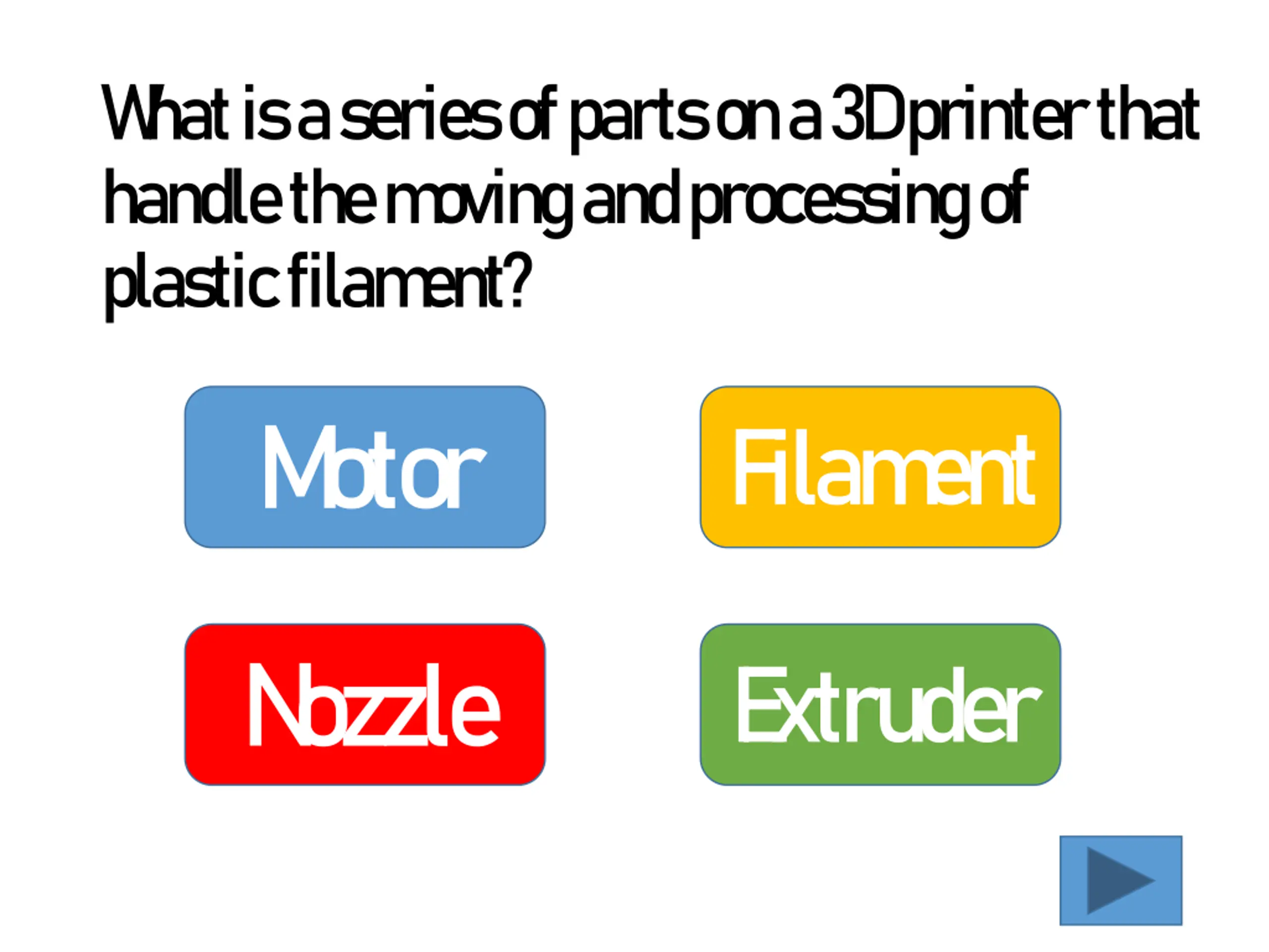 W hat is a series of parts on a 3D printer that handle the m oving and processing of plastic filam ent? Motor Filament M otor Filam ent Nozzle Extruder N ozzle E xtruder