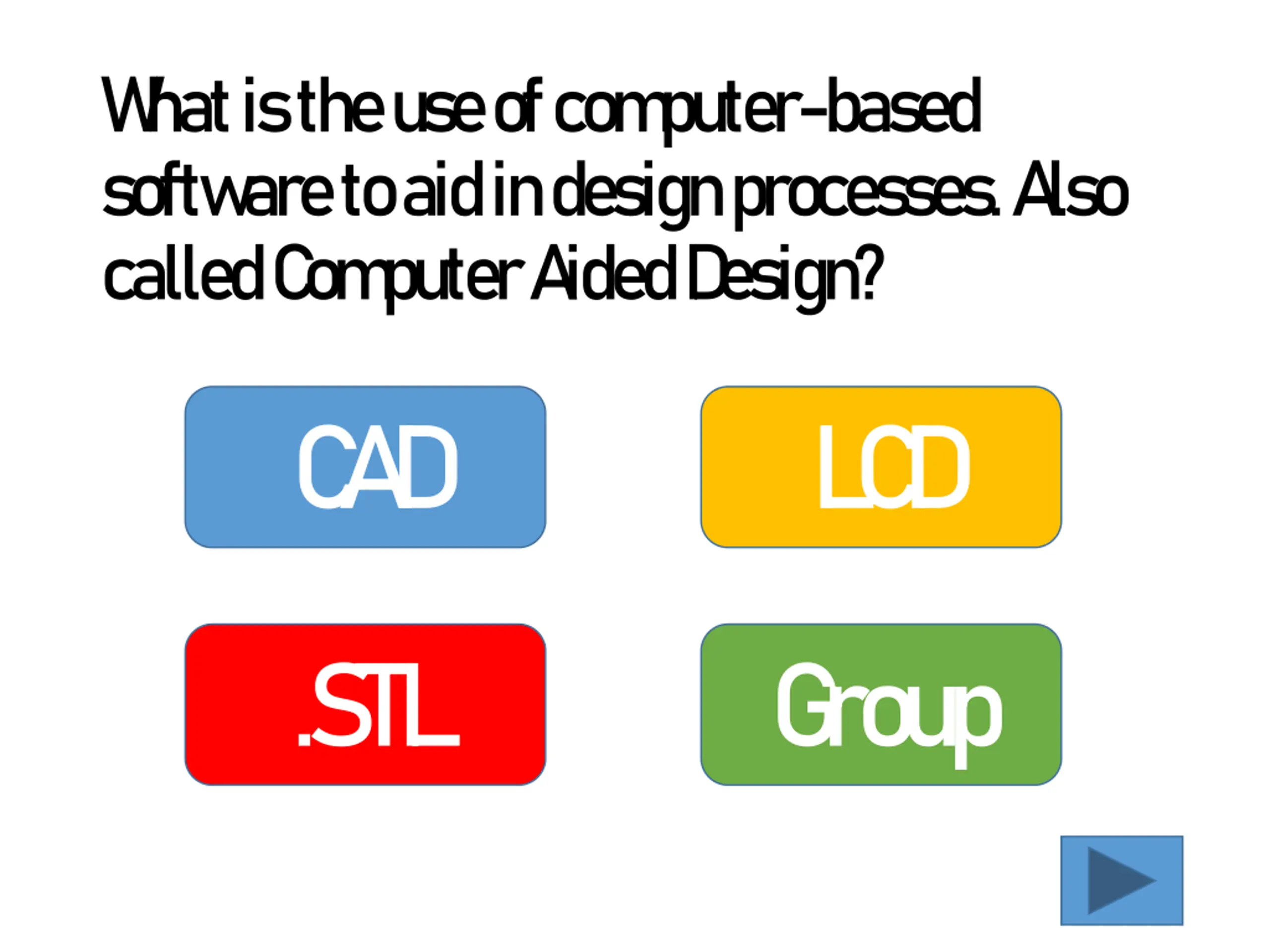W hat is the use of com puter-based softw are to aid in design processes. A lso called C om puter A ided D esign? CAD LCD C A D L C D .STL Group .STL G roup