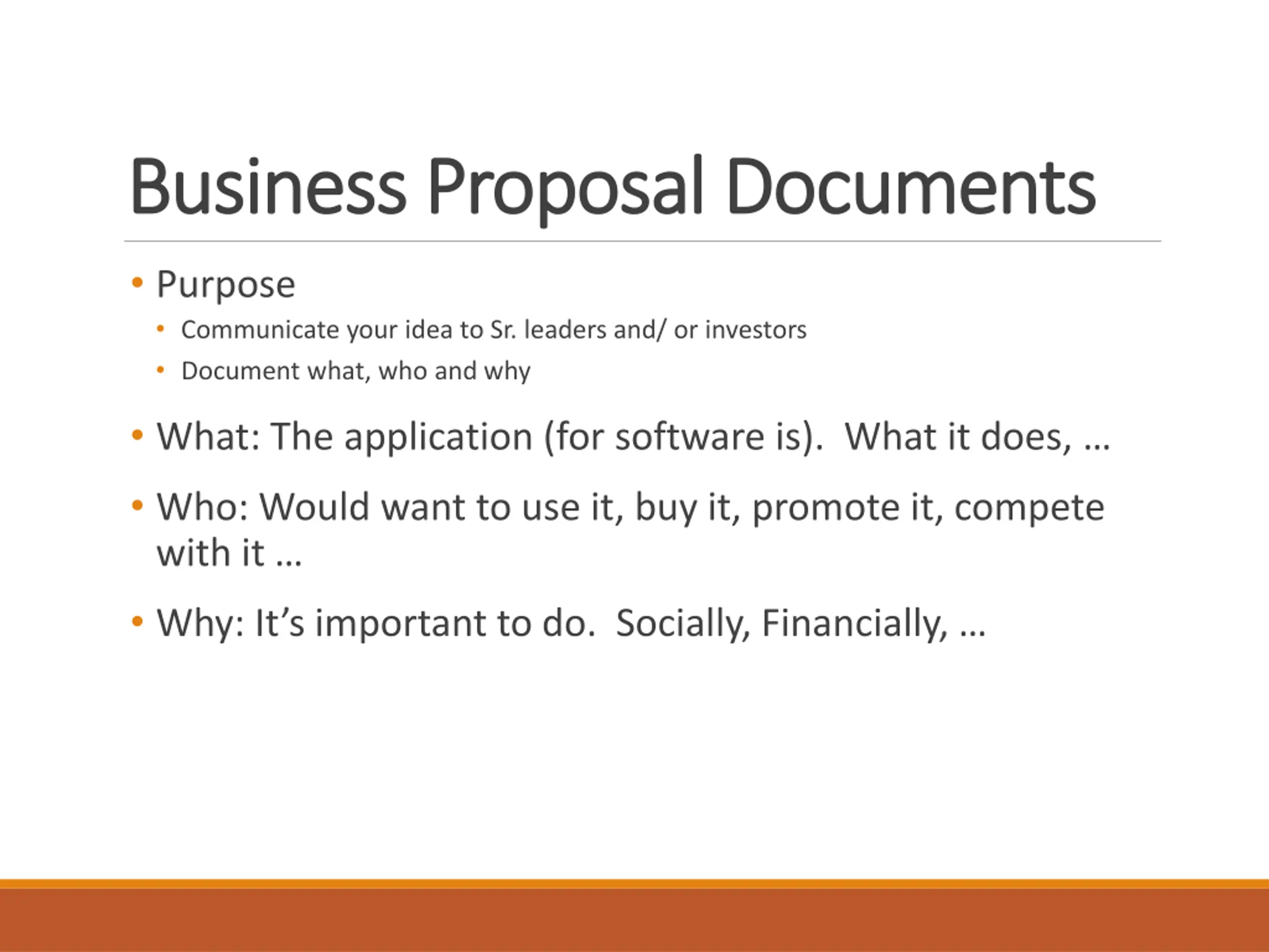 Business Proposal Documents Business Proposal Documents Purpose Communicate your idea to Sr. leaders and/ or investors Document what, who and why What: The application (for software is). What it does, Who: Would want to use it, buy it, promote it, compete with it Why: It s important to do. Socially, Financially,