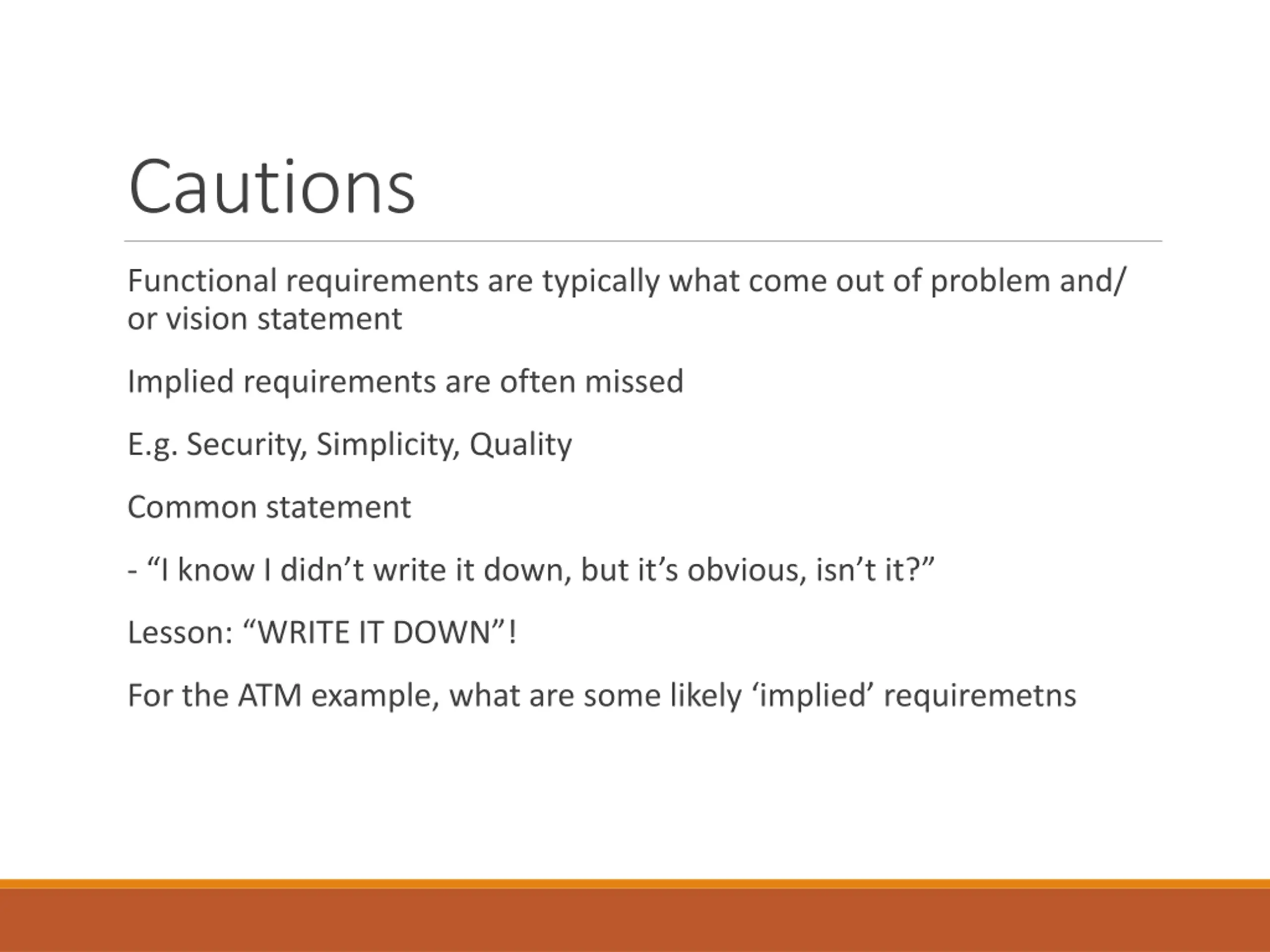 Cautions Functional requirements are typically what come out of problem and/ or vision statement Implied requirements are often missed E.g. Security, Simplicity, Quality Common statement - I know I didn t write it down, but it s obvious, isn t it? Lesson: WRITE IT DOWN ! For the ATM example, what are some likely implied requiremetns
