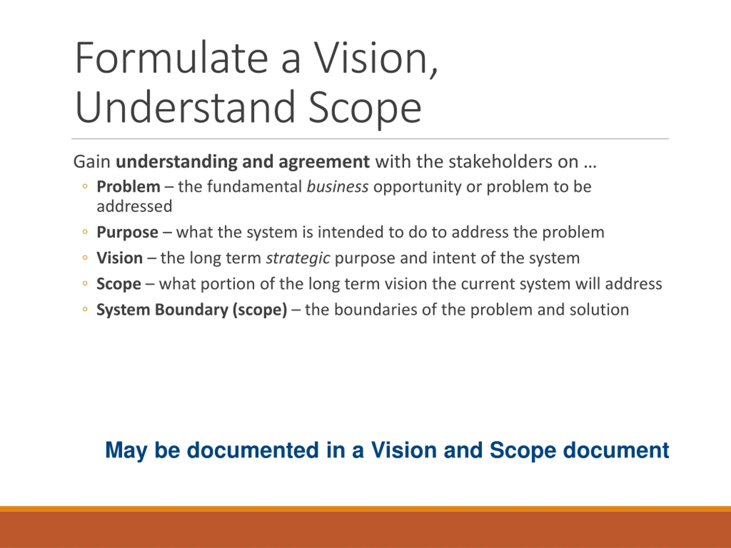 Formulate a Vision, Understand Scope Gain understanding and agreementwith the stakeholders on Problem the fundamental business opportunity or problem to be addressed Purpose what the system is intended to do to address the problem Vision the long term strategic purpose and intent of the system Scope what portion of the long term vision the current system will address System Boundary (scope) the boundaries of the problem and solution May be documented in a Vision and Scope document