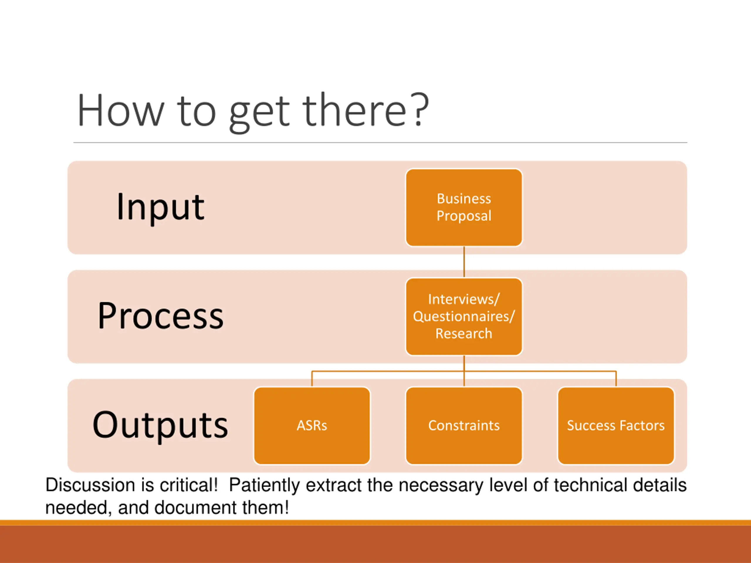 How to get there? Input Business Proposal Interviews/ Questionnaires/ Research Process Outputs ASRs Constraints Success Factors Discussion is critical! Patiently extract the necessary level of technical details needed, and document them!