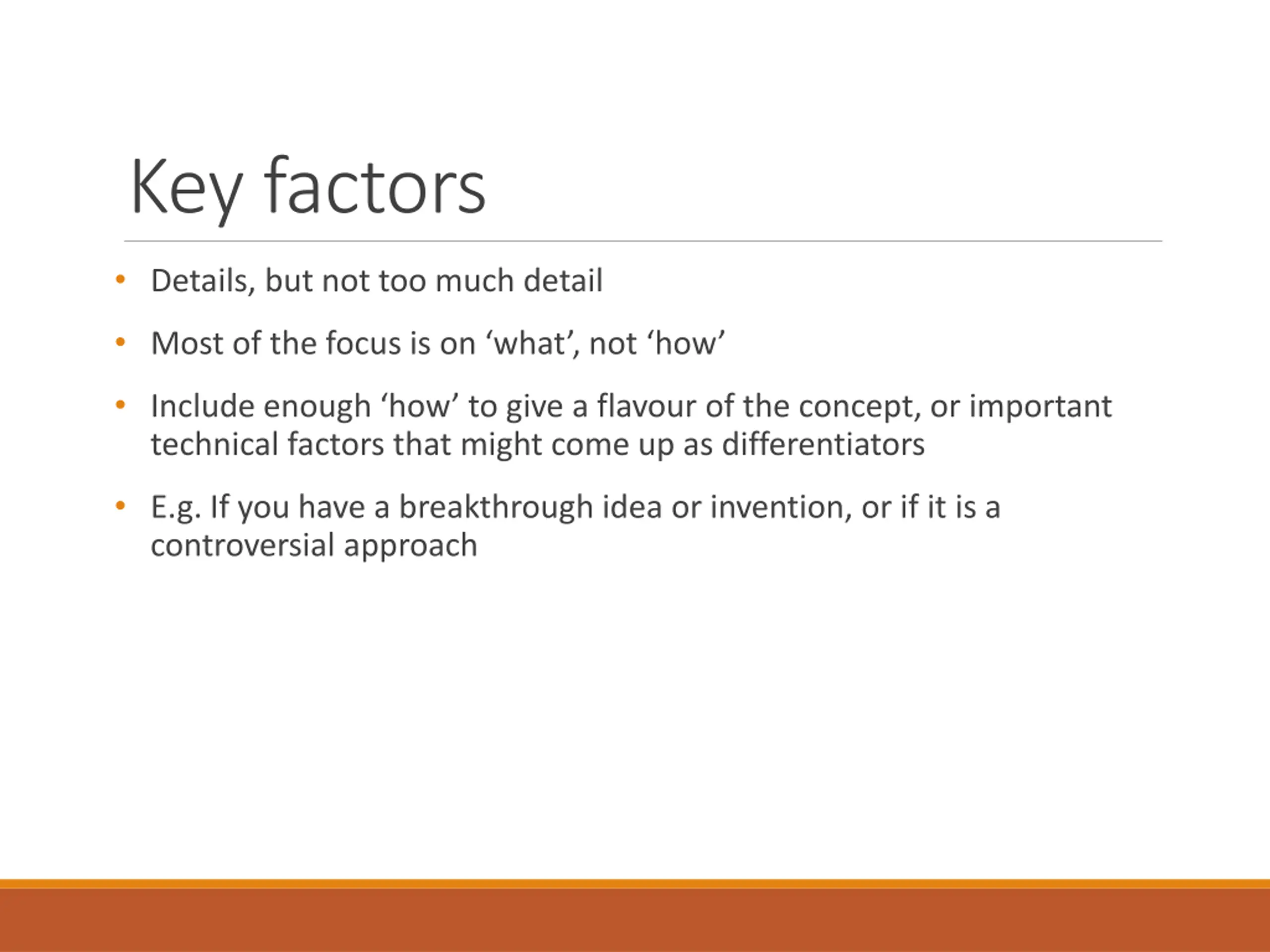Key factors Details, but not too much detail Most of the focus is on what , not how Include enough how to give a flavour of the concept, or important technical factors that might come up as differentiators E.g. If you have a breakthrough idea or invention, or if it is a controversial approach
