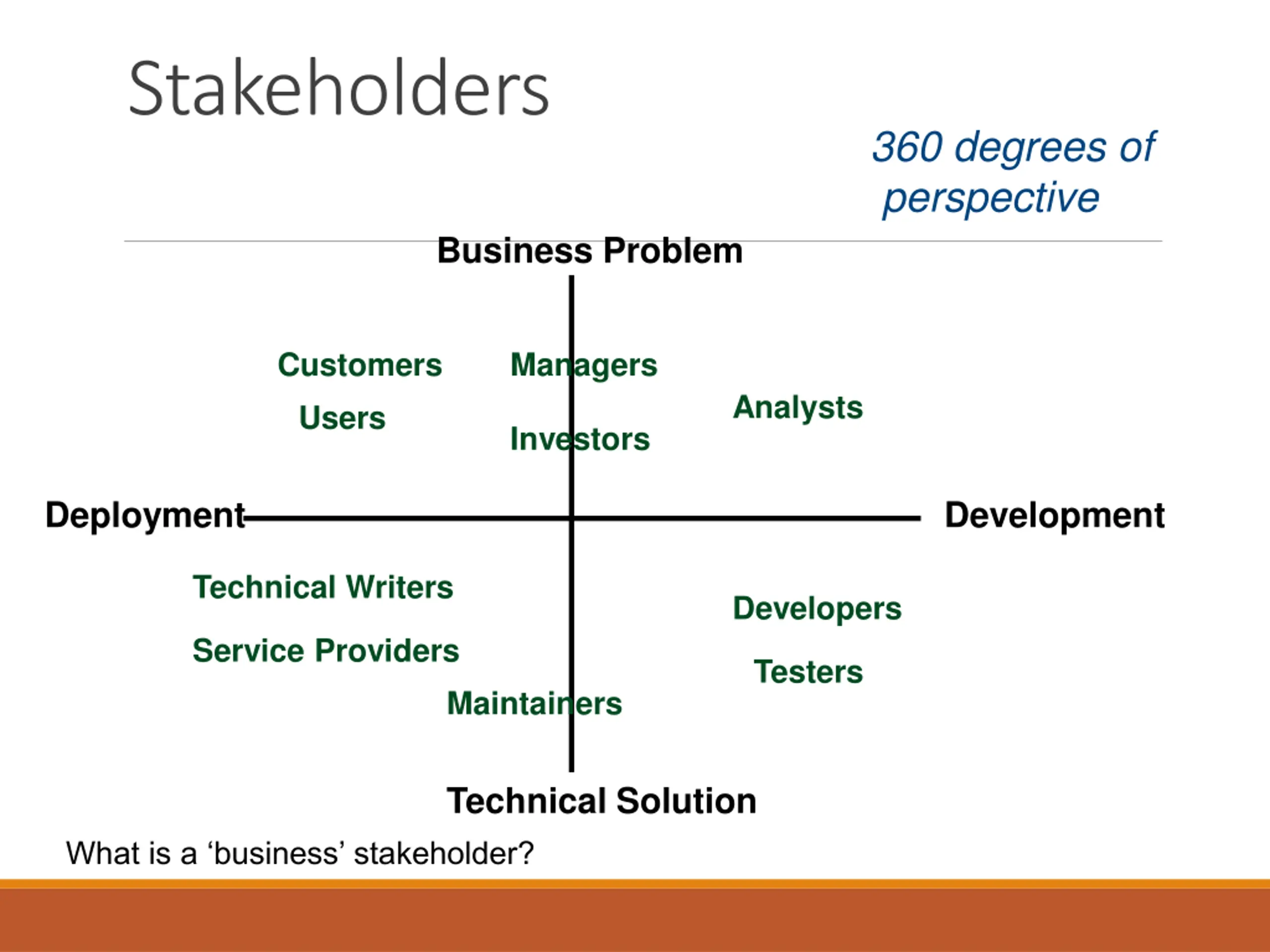 Stakeholders 360 degrees of perspective Business Problem Customers Users Managers Analysts Investors Deployment Development TechnicalWriters Developers ServiceProviders Testers Maintainers Technical Solution What is a business stakeholder?