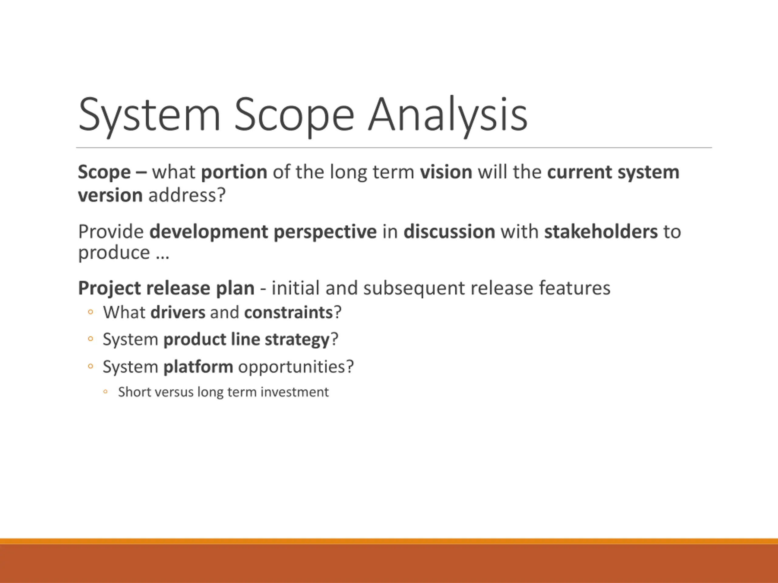 System Scope Analysis Scope what portion of the long term vision will the current system version address? Provide development perspective in discussion with stakeholders to produce Project release plan - initial and subsequent release features What drivers and constraints? System product line strategy? System platform opportunities? Short versus long term investment