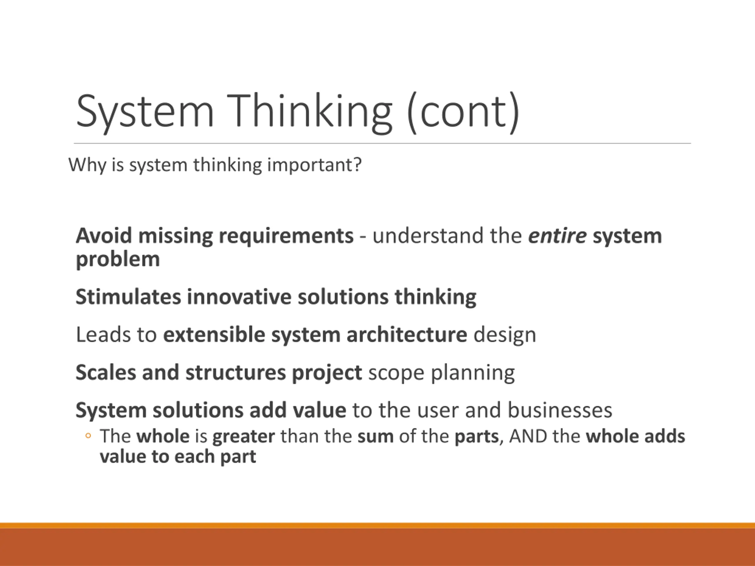 System Thinking (cont) Why is system thinking important? Avoid missing requirements - understand the entire system problem Stimulates innovative solutions thinking Leads to extensible system architecture design Scales and structures project scope planning System solutions add value to the user and businesses The whole is greater than the sum of the parts, AND the whole adds value to each part