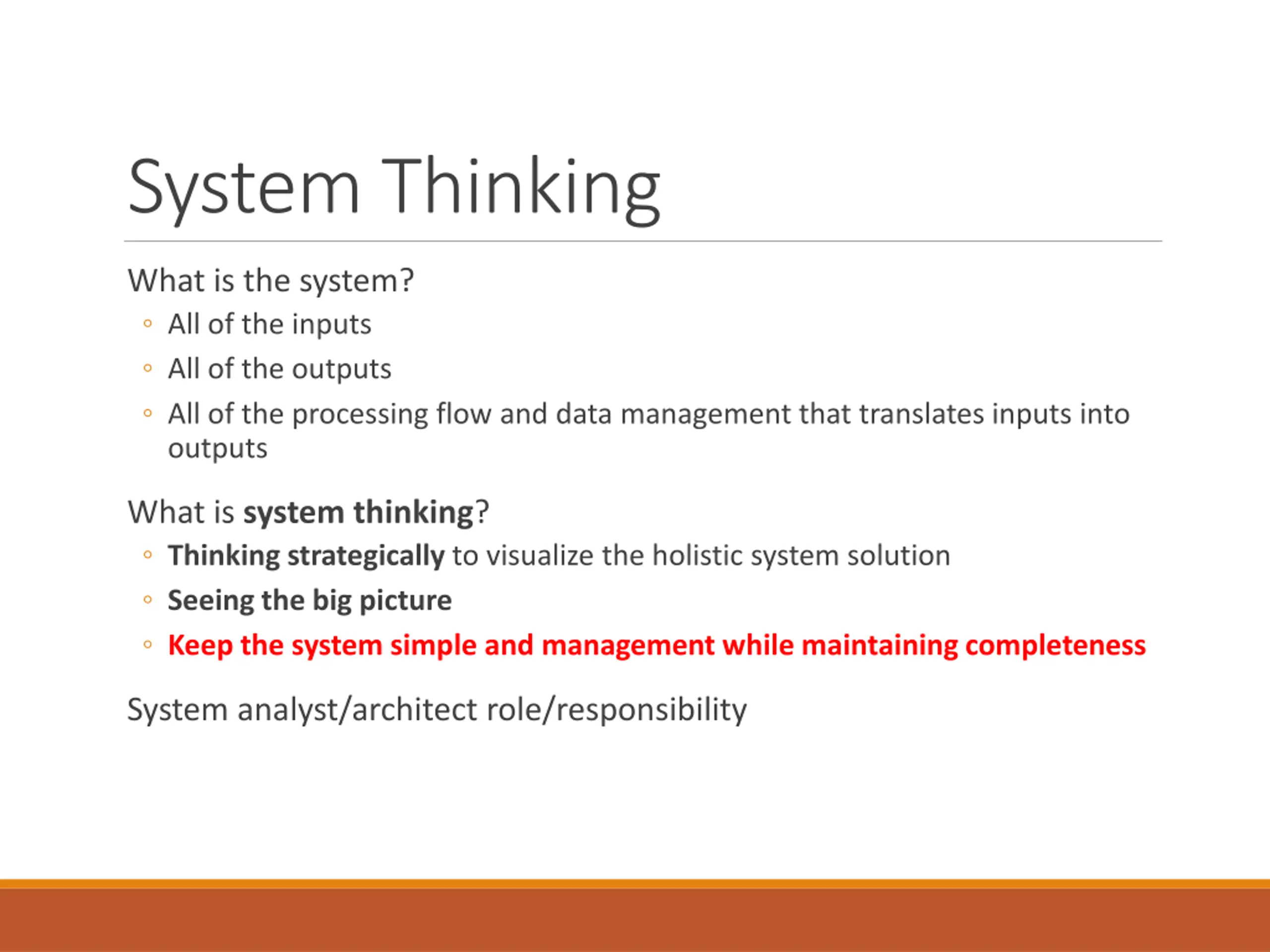 System Thinking What is the system? All of the inputs All of the outputs All of the processing flow and data management that translates inputs into outputs What is system thinking? Thinking strategically to visualize the holistic system solution Seeing the big picture Keep the system simple and management while maintaining completeness System analyst/architect role/responsibility
