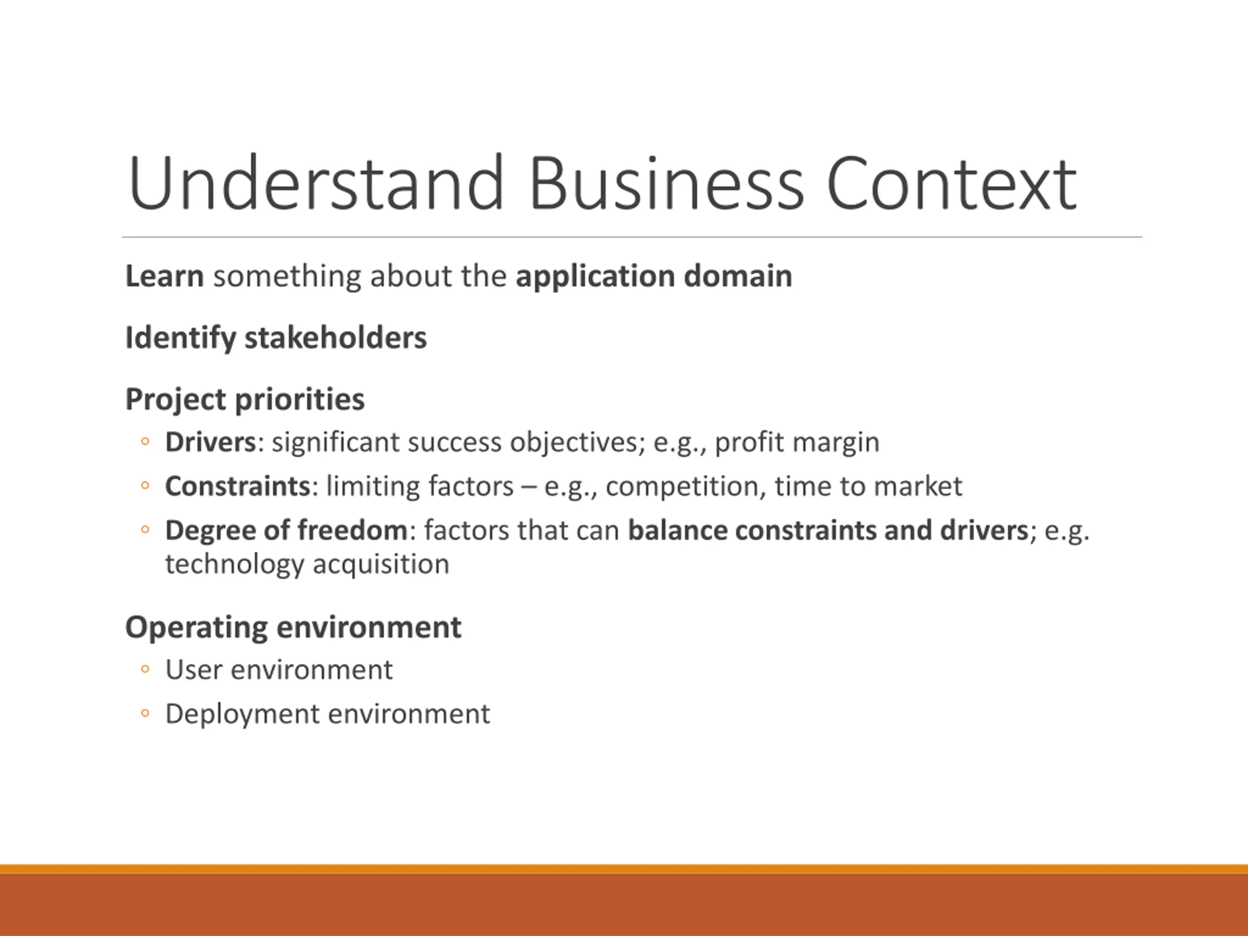 Understand Business Context Learn something about the application domain Identify stakeholders Project priorities Drivers: significant success objectives; e.g., profit margin Constraints: limiting factors e.g., competition, time to market Degree of freedom: factors that can balance constraints and drivers; e.g. technology acquisition Operating environment User environment Deployment environment