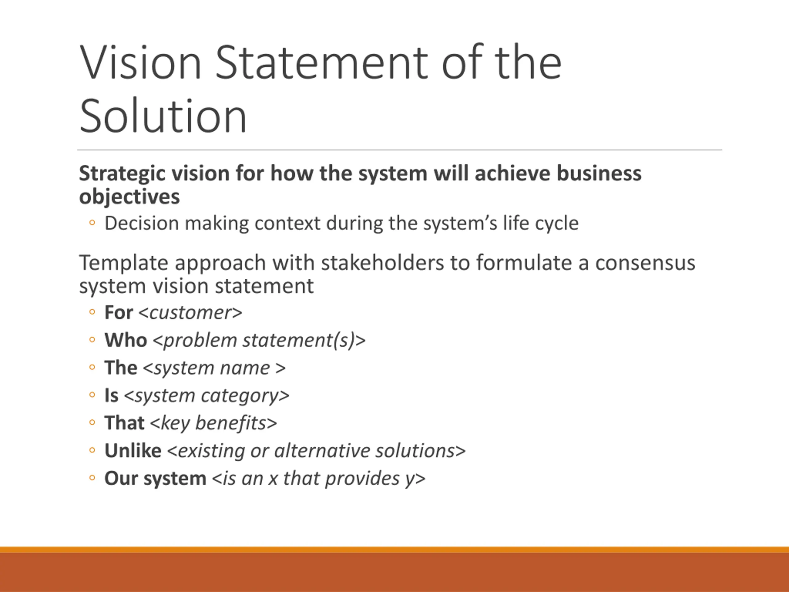 Vision Statement of the Solution Strategic vision for how the system will achieve business objectives Decision making context during the system s life cycle Template approach with stakeholders to formulate a consensus system vision statement For <customer> Who <problem statement(s)> The <system name > Is <system category> That <keybenefits> Unlike <existing or alternative solutions> Our system <is an x that provides y>