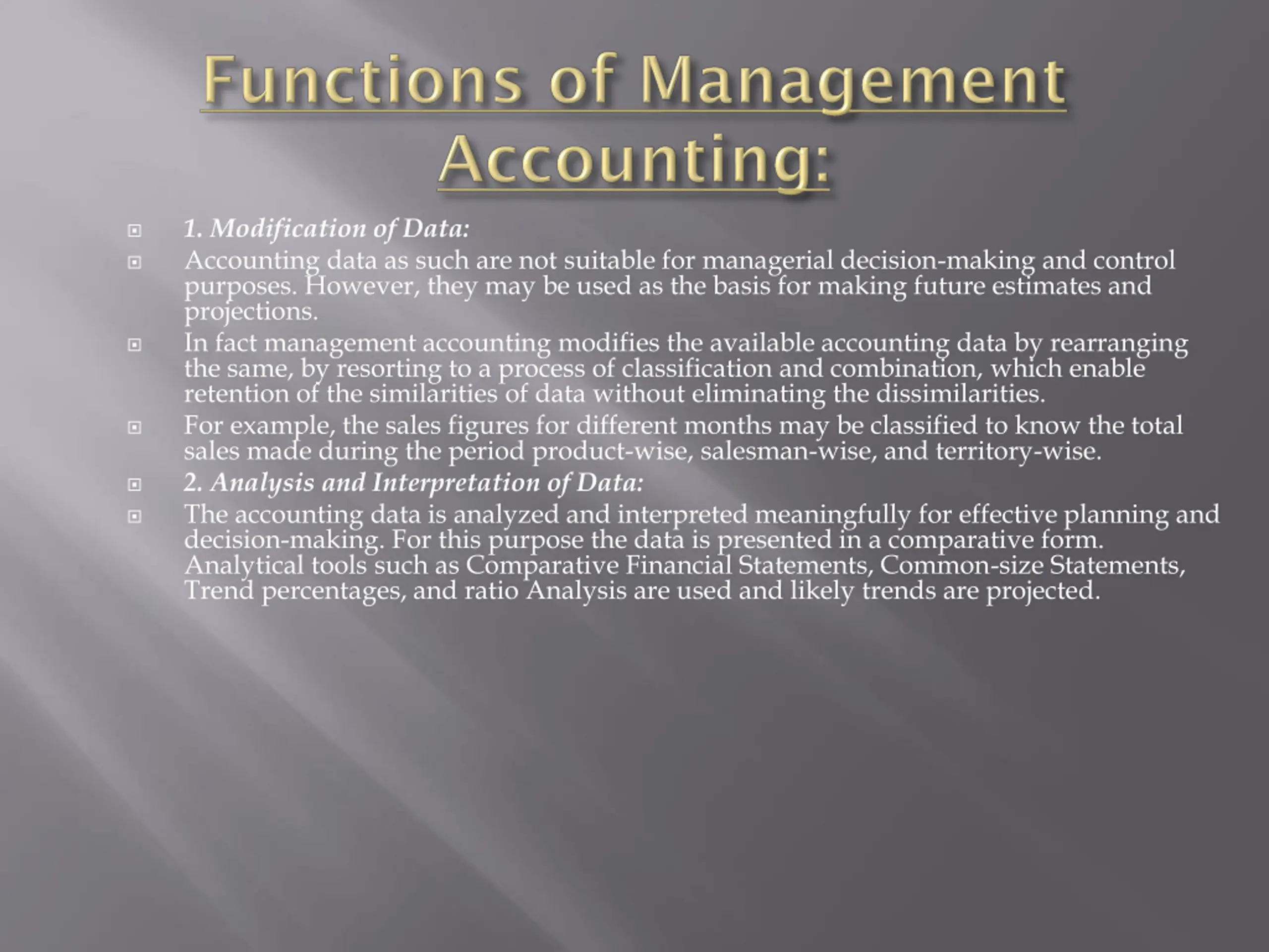 1. Modification of Data: Accounting data as such are not suitable for managerial decision-making and control purposes. However, they may be used as the basis for making future estimates and projections. In fact management accounting modifies the available accounting data by rearranging the same, by resorting to a process of classification and combination, which enable retention of the similarities of data without eliminating the dissimilarities. For example, the sales figures for different months may be classified to know the total sales made during the period product-wise, salesman-wise, and territory-wise. 2. Analysis and Interpretation of Data: The accounting data is analyzed and interpreted meaningfully for effective planning and decision-making. For this purpose the data is presented in a comparative form. Analytical tools such as Comparative Financial Statements, Common-size Statements, Trend percentages, and ratio Analysis are used and likely trends are projected.