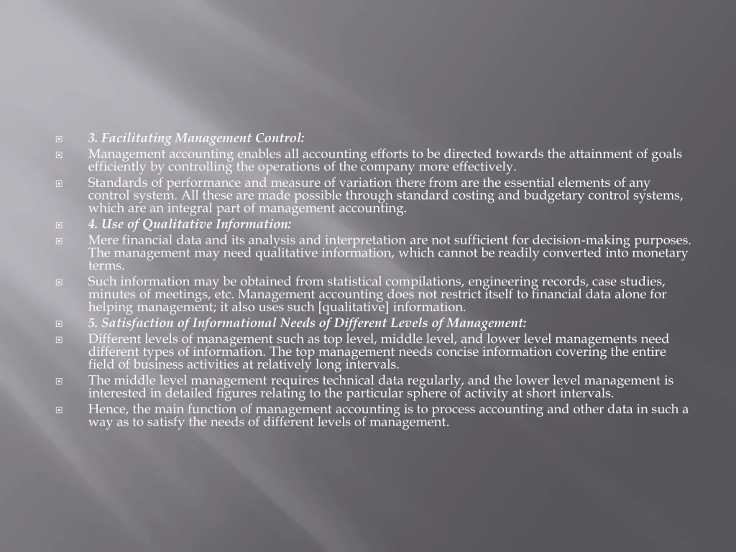 3. Facilitating Management Control: Management accounting enables all accounting efforts to be directed towards the attainment of goals efficiently by controlling the operations of the company more effectively. Standards of performance and measure of variation there from are the essential elements of any control system. All these are made possible through standard costing and budgetary control systems, which are an integral part of management accounting. 4. Use of Qualitative Information: Mere financial data and its analysis and interpretation are not sufficient for decision-making purposes. The management may need qualitative information, which cannot be readily converted into monetary terms. Such information may be obtained from statistical compilations, engineering records, case studies, minutes of meetings, etc. Management accounting does not restrict itself to financial data alone for helping management; it also uses such [qualitative] information. 5. Satisfaction of Informational Needs of Different Levels of Management: Different levels of management such as top level, middle level, and lower level managements need different types of information. The top management needs concise information covering the entire field of business activities at relatively long intervals. The middle level management requires technical data regularly, and the lower level management is interested in detailed figures relating to the particular sphere of activity at short intervals. Hence, the main function of management accounting is to process accounting and other data in such a way as to satisfy the needs of different levels of management.