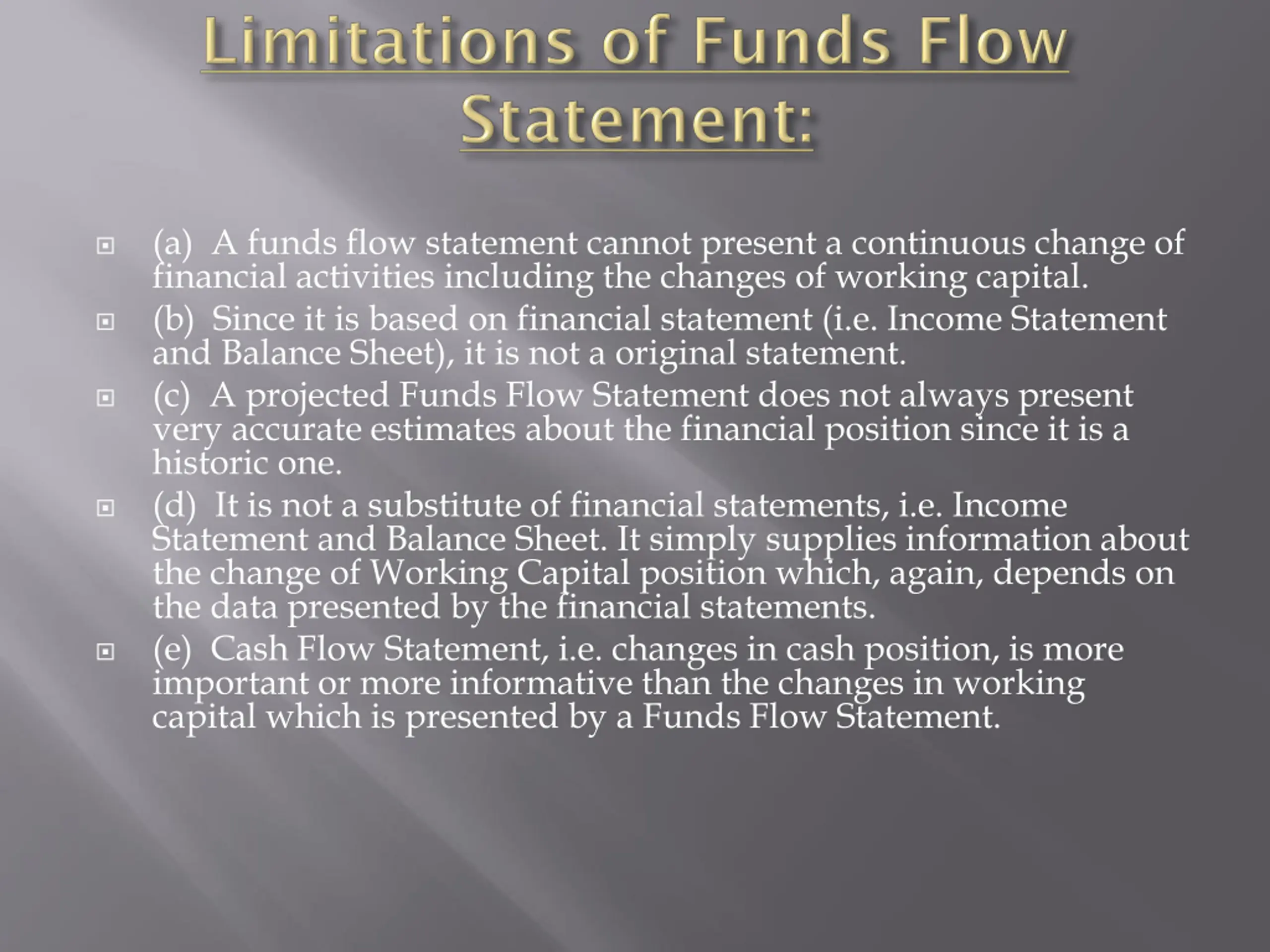 (a) A funds flow statement cannot present a continuous change of financial activities including the changes of working capital. (b) Since it is based on financial statement (i.e. Income Statement and Balance Sheet), it is not a original statement. (c) A projected Funds Flow Statement does not always present very accurate estimates about the financial position since it is a historic one. (d) It is not a substitute of financial statements, i.e. Income Statement and Balance Sheet. It simply supplies information about the change of Working Capital position which, again, depends on the data presented by the financial statements. (e) Cash Flow Statement, i.e. changes in cash position, is more important or more informative than the changes in working capital which is presented by a Funds Flow Statement.