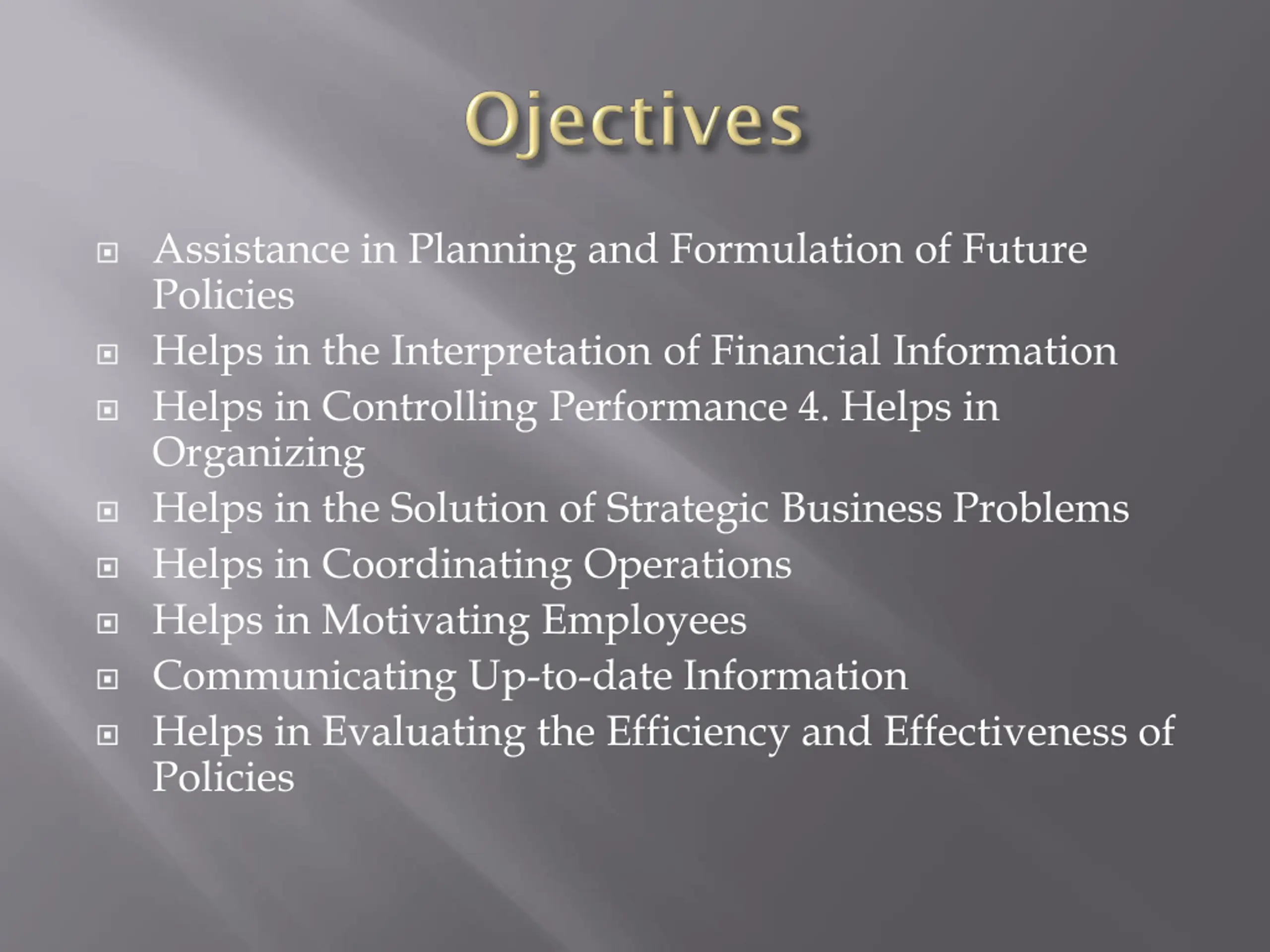 Assistance in Planning and Formulation of Future Policies Helps in the Interpretation of Financial Information Helps in Controlling Performance 4. Helps in Organizing Helps in the Solution of Strategic Business Problems Helps in Coordinating Operations Helps in Motivating Employees Communicating Up-to-date Information Helps in Evaluating the Efficiency and Effectiveness of Policies