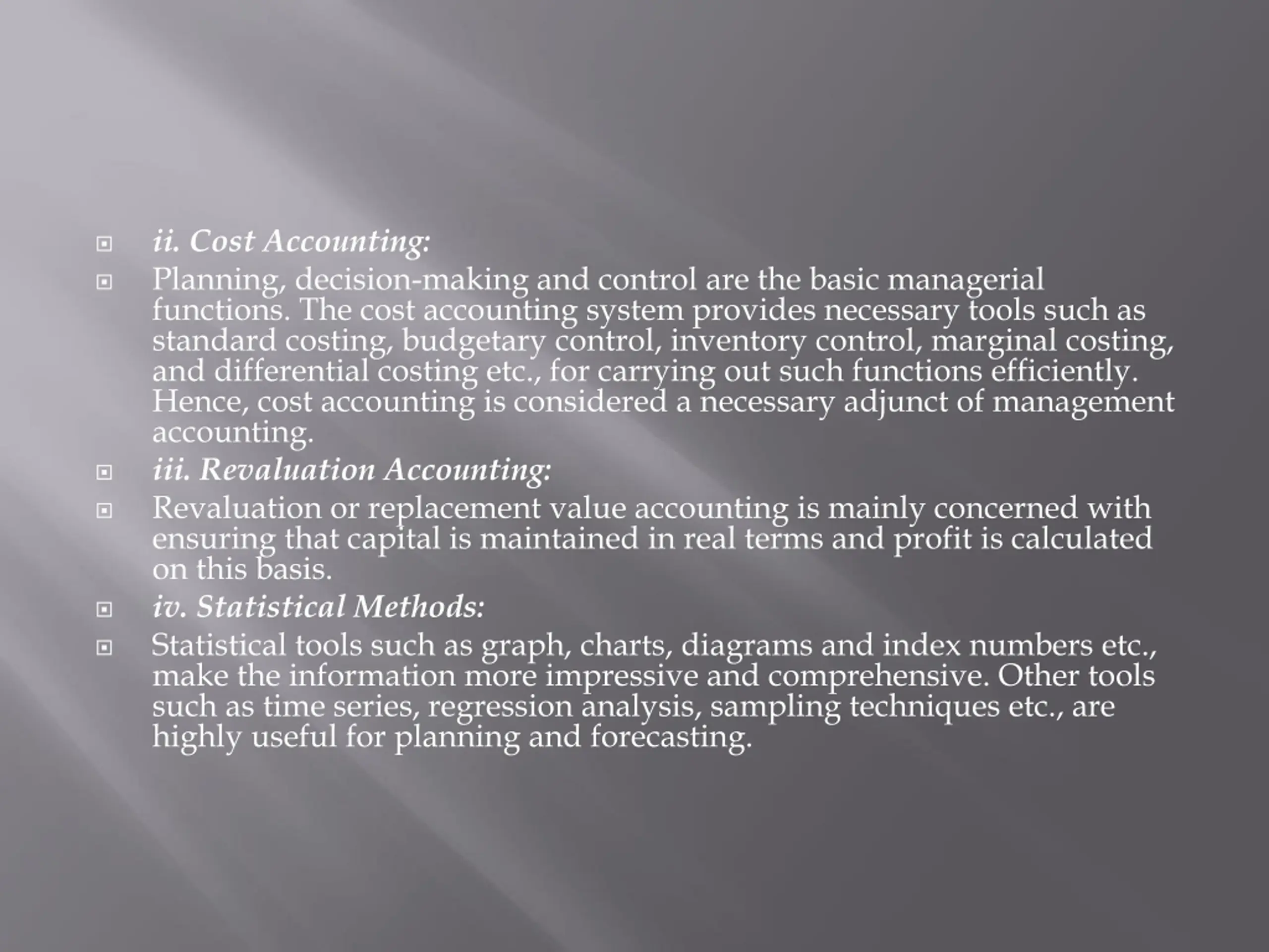ii. Cost Accounting: Planning, decision-making and control are the basic managerial functions. The cost accounting system provides necessary tools such as standard costing, budgetary control, inventory control, marginal costing, and differential costing etc., for carrying out such functions efficiently. Hence, cost accounting is considered a necessary adjunct of management accounting. iii. Revaluation Accounting: Revaluation or replacement value accounting is mainly concerned with ensuring that capital is maintained in real terms and profit is calculated on this basis. iv. Statistical Methods: Statistical tools such as graph, charts, diagrams and index numbers etc., make the information more impressive and comprehensive. Other tools such as time series, regression analysis, sampling techniques etc., are highly useful for planning and forecasting.
