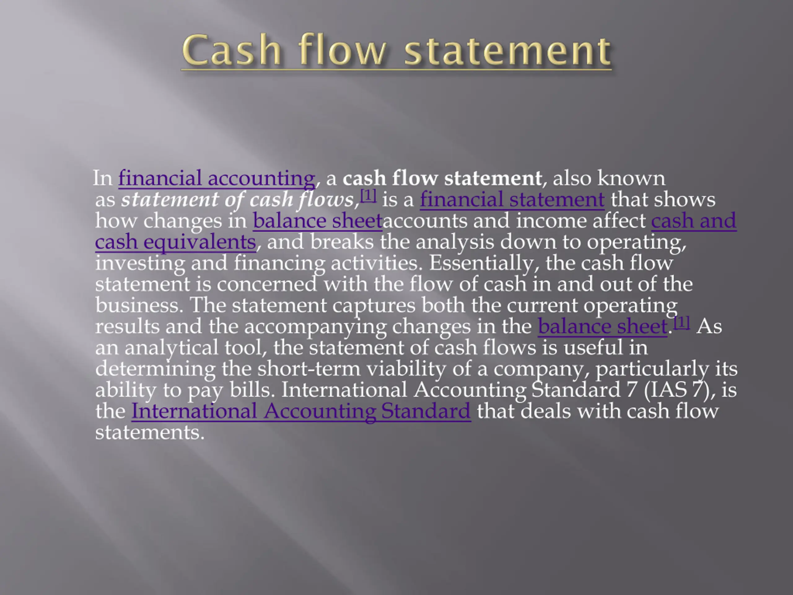 In financial accounting, a cash flow statement, also known as statement of cash flows,[1]is a financial statement that shows how changes in balance sheetaccounts and income affect cash and cash equivalents, and breaks the analysis down to operating, investing and financing activities. Essentially, the cash flow statement is concerned with the flow of cash in and out of the business. The statement captures both the current operating results and the accompanying changes in the balance sheet.[1]As an analytical tool, the statement of cash flows is useful in determining the short-term viability of a company, particularly its ability to pay bills. International Accounting Standard 7 (IAS 7), is the International Accounting Standard that deals with cash flow statements.