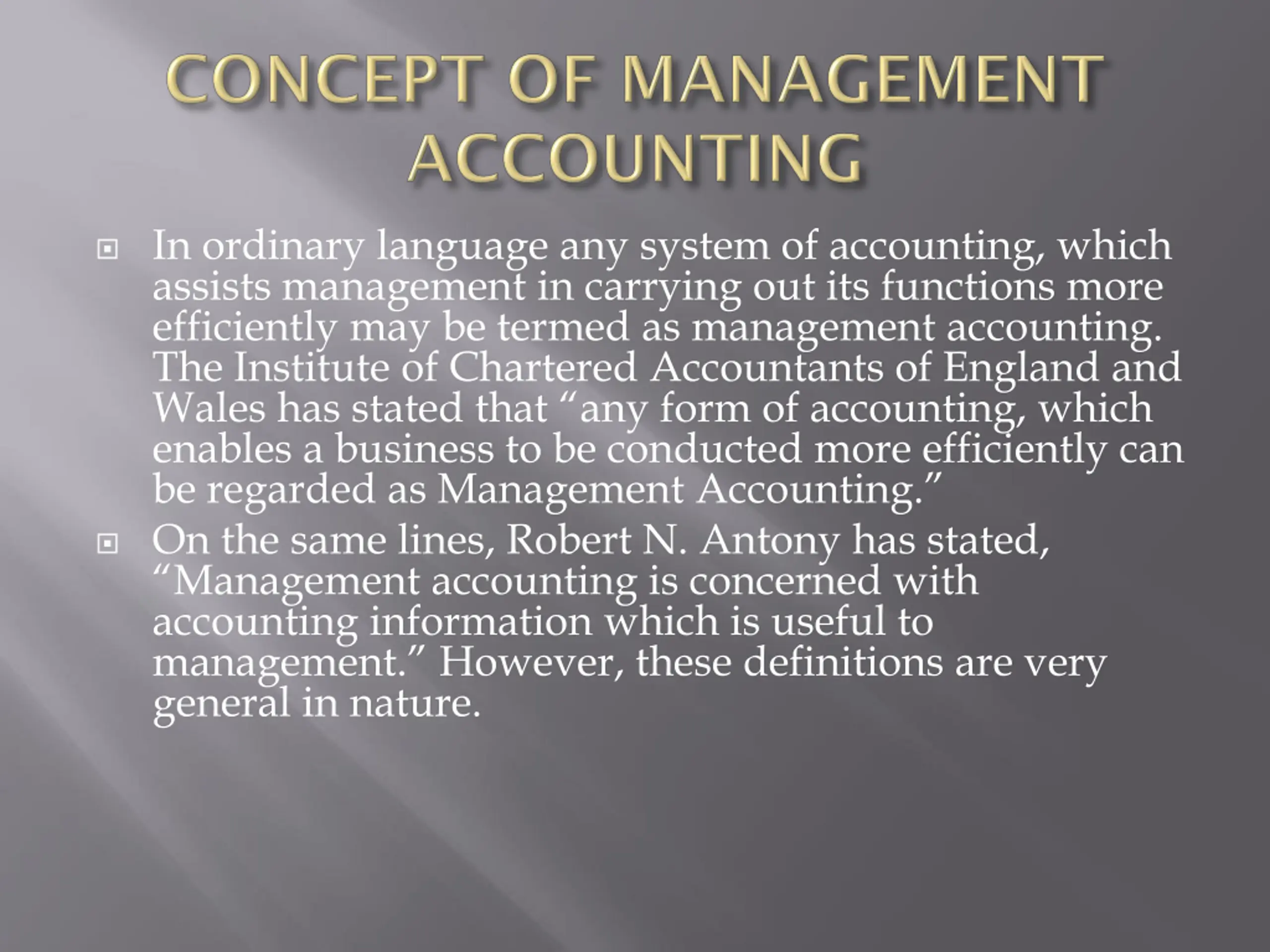 In ordinary language any system of accounting, which assists management in carrying out its functions more efficiently may be termed as management accounting. The Institute of Chartered Accountants of England and Wales has stated that any form of accounting, which enables a business to be conducted more efficiently can be regarded as Management Accounting. On the same lines, Robert N. Antony has stated, Management accounting is concerned with accounting information which is useful to management. However, these definitions are very general in nature.