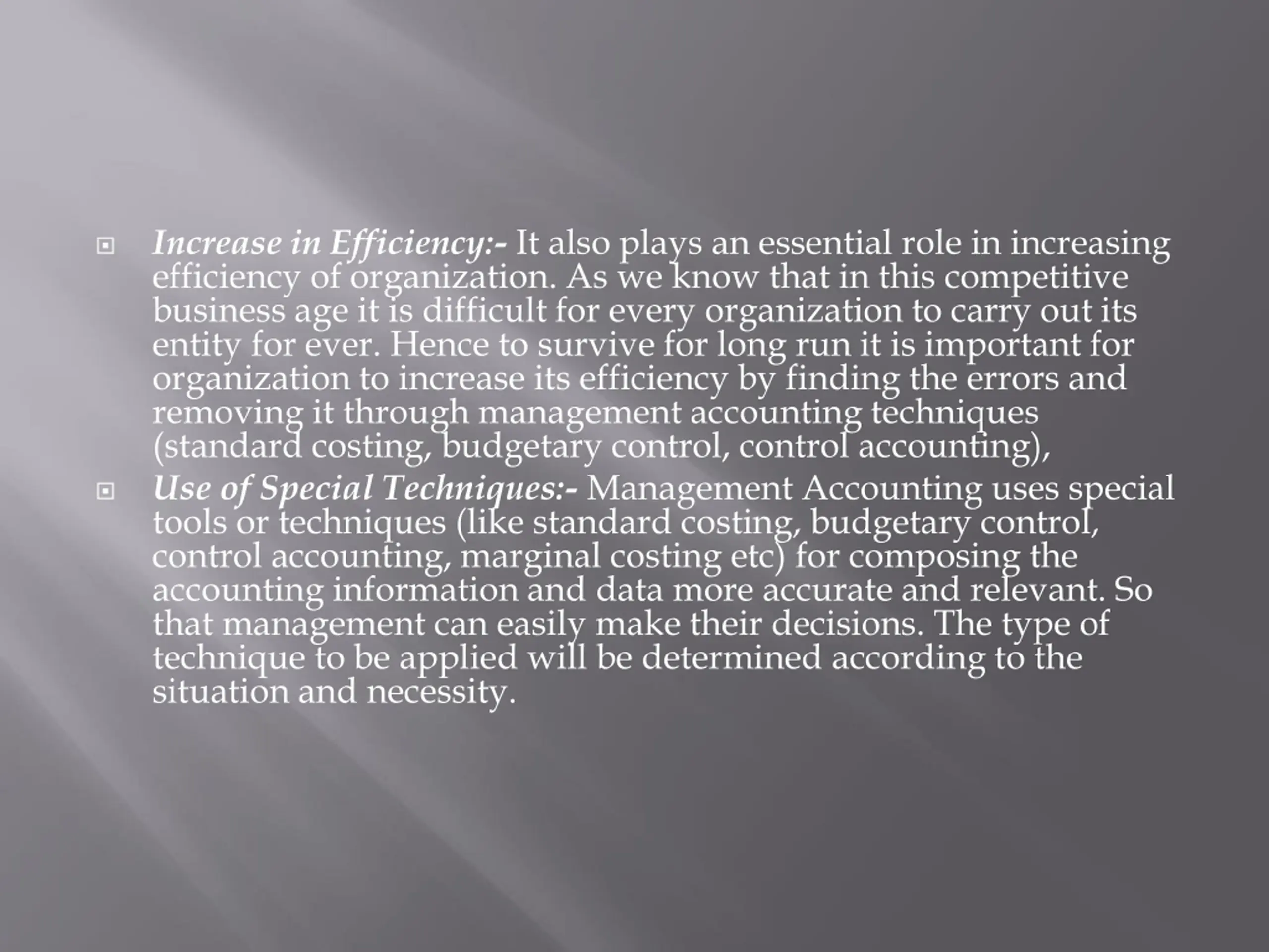 Increase in Efficiency:- It also plays an essential role in increasing efficiency of organization. As we know that in this competitive business age it is difficult for every organization to carry out its entity for ever. Hence to survive for long run it is important for organization to increase its efficiency by finding the errors and removing it through management accounting techniques (standard costing, budgetary control, control accounting), Use of Special Techniques:- Management Accounting uses special tools or techniques (like standard costing, budgetary control, control accounting, marginal costing etc) for composing the accounting information and data more accurate and relevant. So that management can easily make their decisions. The type of technique to be applied will be determined according to the situation and necessity.