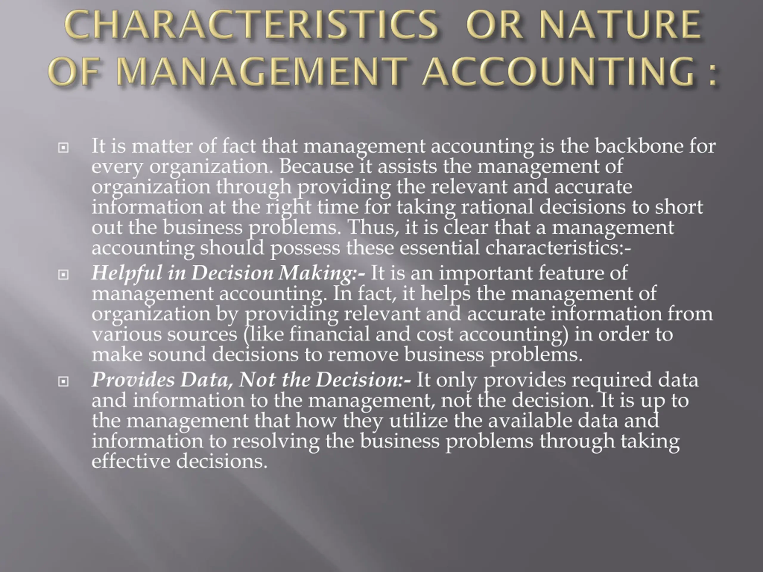 It is matter of fact that management accounting is the backbone for every organization. Because it assists the management of organization through providing the relevant and accurate information at the right time for taking rational decisions to short out the business problems. Thus, it is clear that a management accounting should possess these essential characteristics:- Helpful in Decision Making:- It is an important feature of management accounting. In fact, it helps the management of organization by providing relevant and accurate information from various sources (like financial and cost accounting) in order to make sound decisions to remove business problems. Provides Data, Not the Decision:- It only provides required data and information to the management, not the decision. It is up to the management that how they utilize the available data and information to resolving the business problems through taking effective decisions.