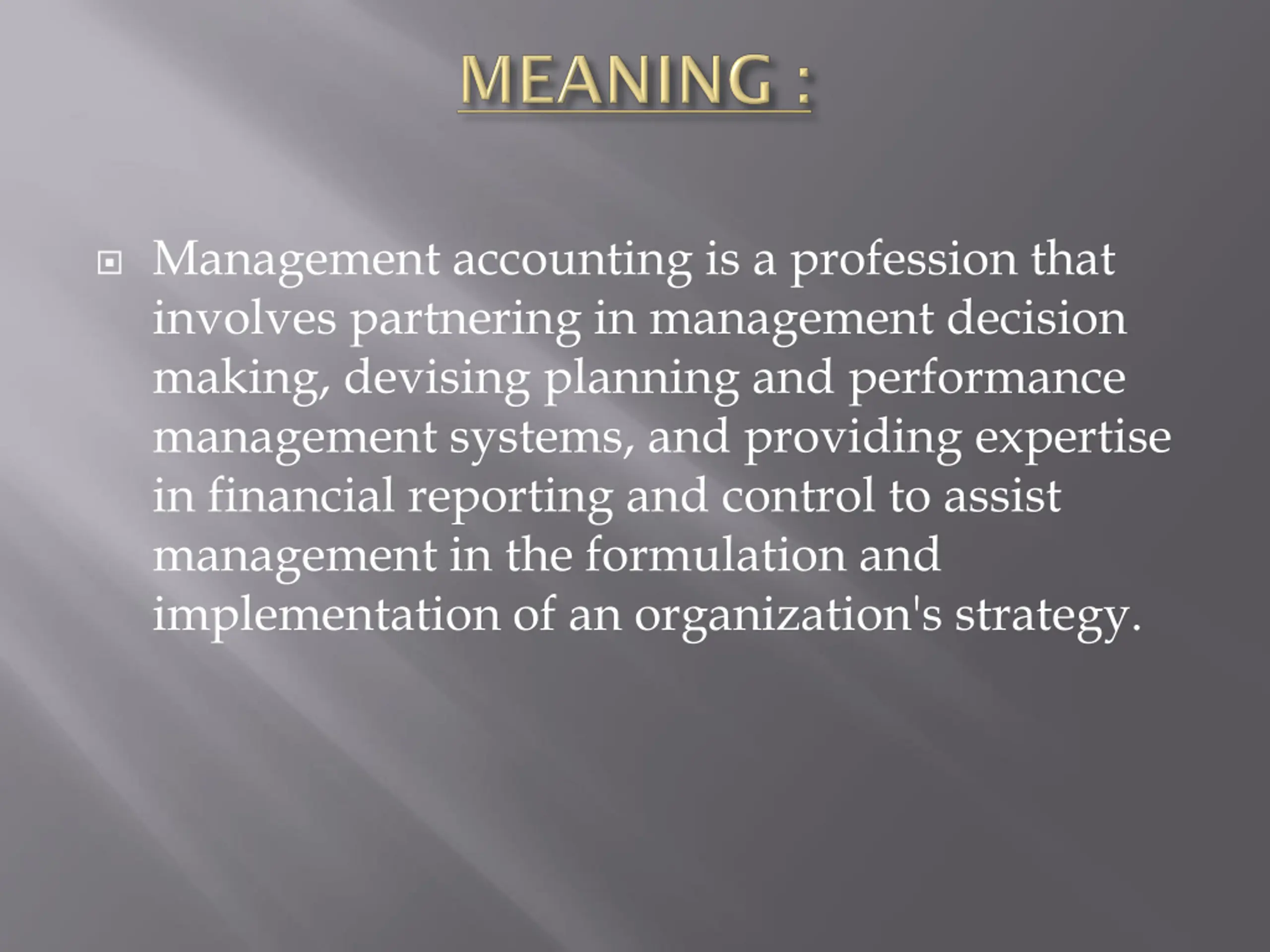 Management accounting is a profession that involves partnering in management decision making, devising planning and performance management systems, and providing expertise in financial reporting and control to assist management in the formulation and implementation of an organization's strategy.