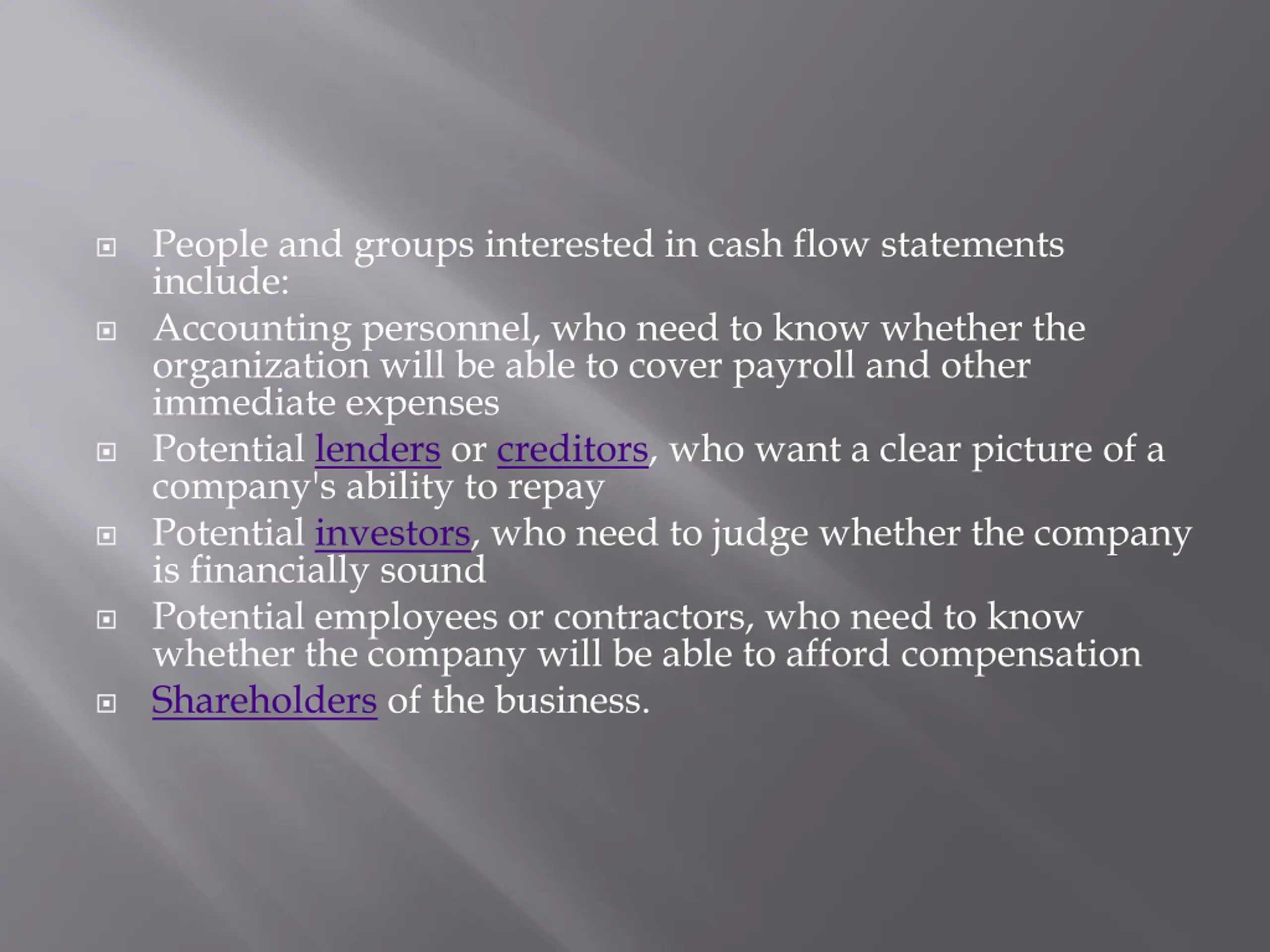 People and groups interested in cash flow statements include: Accounting personnel, who need to know whether the organization will be able to cover payroll and other immediate expenses Potential lenders or creditors, who want a clear picture of a company's ability to repay Potential investors, who need to judge whether the company is financially sound Potential employees or contractors, who need to know whether the company will be able to afford compensation Shareholders of the business.